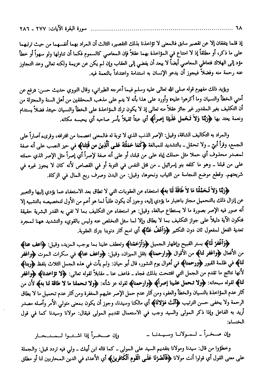 وَاغْفِرْ لَنا بستر القبيح وإظهار الجميل وَارْحَمْنا وتعطف علينا بما يوجب المزيد، وقيل: اعْفُ عَنَّا من الأفعال وَاغْفِرْ لَنا من الأقوال وَارْحَمْنا بثقل الميزان، وقيل: وَاعْفُ عَنَّا في سكرات الموت وَاغْفِرْ لَنا في ظلمة القبور وَارْحَمْنا في أهوال يوم النشور، قال أبو حيان: ولم يأت في هذه الجمل الثلاث بلفظ رَبَّنا لأنها نتائج ما تقدم من الجمل التي افتتحت بذلك فجاء- فاعف عنا- مقابلا لقوله تعالى: لا تُؤاخِذْنا وَاغْفِرْ لَنا لقوله سبحانه: وَلا تَحْمِلْ عَلَيْنا إِصْراً وَارْحَمْنا لقوله عز شأنه: وَلا تُحَمِّلْنا ما لا طاقَةَ لَنا بِهِ لأن من آثار عدم المؤاخذة بالنسيان والخطأ والعفو، ومن آثار عدم حمل الإصر عليهم المغفرة ومن آثار عدم تحميل ما لا يطاق الرحمة ولا يخفى حسن الترتيب أَنْتَ مَوْلانا أي مالكنا وسيدنا، وجوز أن يكون بمعنى متولي الأمر وأصله مصدر أريد به الفاعل وإذا ذكر المولى والسيد وجب في الاستعمال تقديم المولى فيقال: مولانا وسيدنا كما في قول الخنساء: