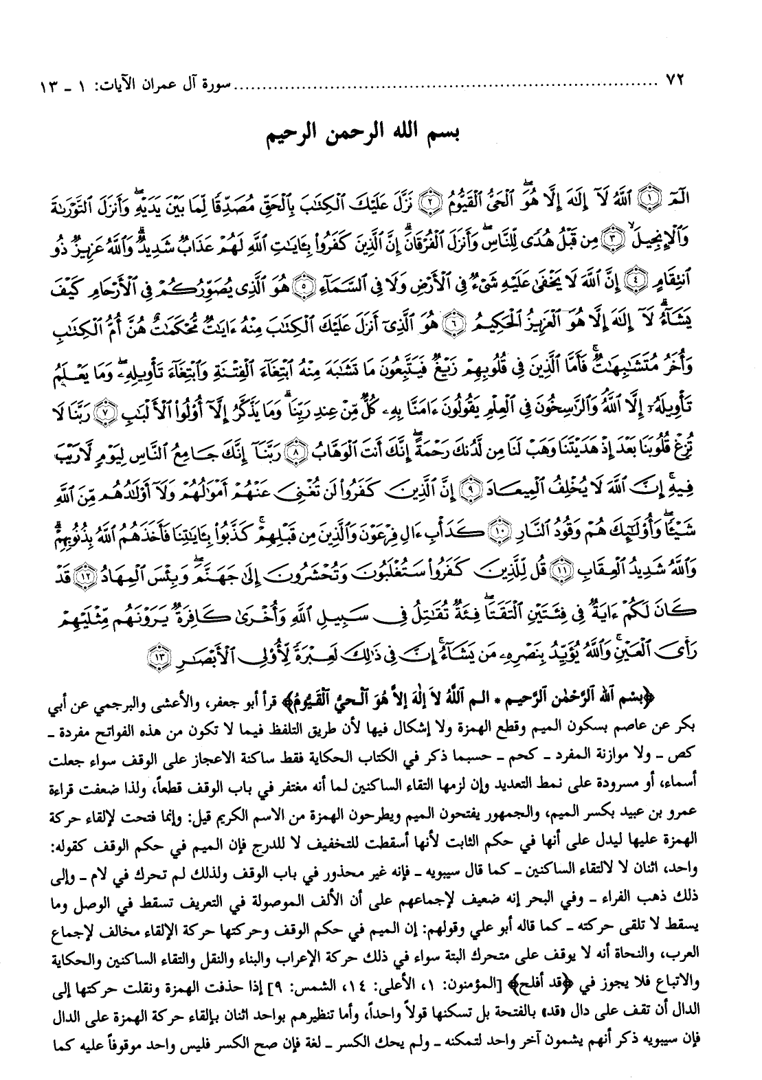 بِسْمِ اللَّهِ الرَّحْمنِ الرَّحِيمِ الم اللَّهُ لا إِلهَ إِلَّا هُوَ الْحَيُّ الْقَيُّومُ قرأ أبو جعفر، والأعشى والبرجمي عن أبي بكر عن عاصم بسكون الميم وقطع الهمزة ولا إشكال فيها لأن طريق التلفظ فيما لا تكون من هذه الفواتح مفردة- كص- ولا موازنة المفرد- كحم- حسبما ذكر في الكتاب الحكاية فقط ساكنة الاعجاز على الوقف سواء جعلت أسماء، أو مسرودة على نمط التعديد وإن لزمها التقاء الساكنين لما أنه مغتفر في باب الوقف قطعا، ولذا ضعفت قراءة عمرو بن عبيد بكسر الميم، والجمهور يفتحون الميم ويطرحون الهمزة من الاسم الكريم قيل: وإنما فتحت لإلقاء حركة الهمزة عليها ليدل على أنها في حكم الثابت لأنها أسقطت للتخفيف لا للدرج فإن الميم في حكم الوقف كقوله: