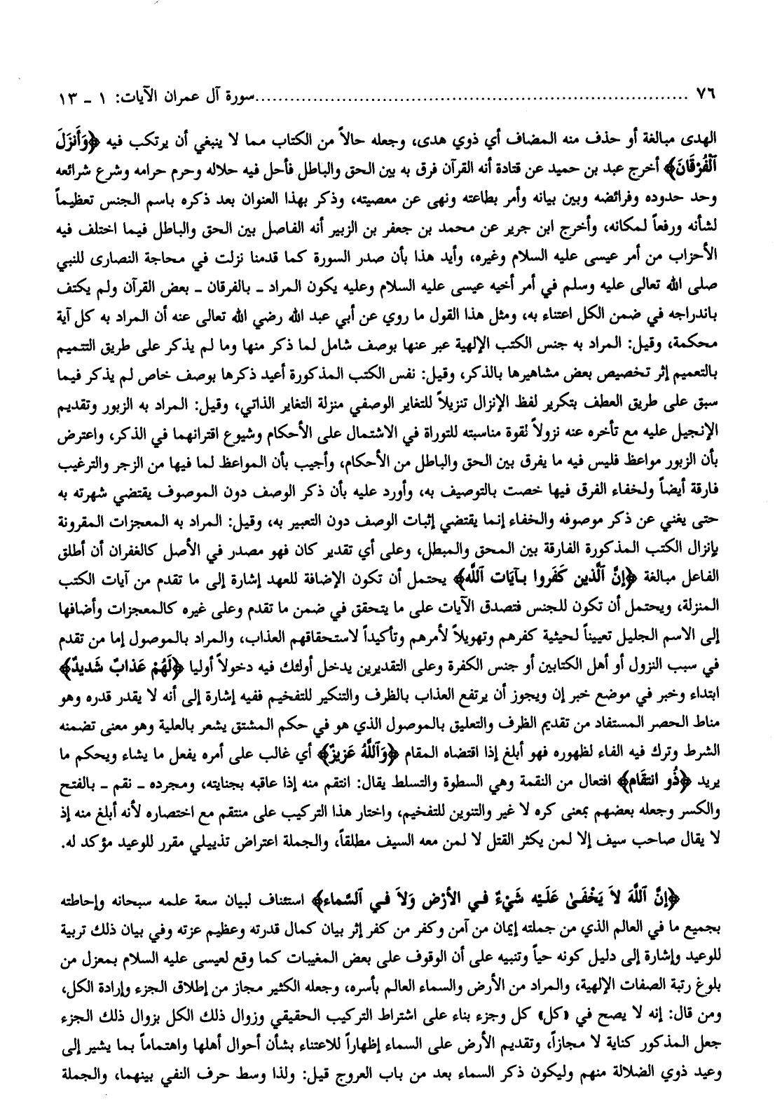 وقيل: المراد به جنس الكتب الإلهية عبر عنها بوصف شامل لما ذكر منها وما لم يذكر على طريق التتميم بالتعميم إثر تخصيص بعض مشاهيرها بالذكر، وقيل: نفس الكتب المذكورة أعيد ذكرها بوصف خاص لم يذكر فيما سبق على طريق العطف بتكرير لفظ الإنزال تنزيلا للتغاير الوصفي منزلة التغاير الذاتي، وقيل: المراد به الزبور وتقديم الإنجيل عليه مع تأخره عنه نزولا لقوة مناسبته للتوراة في الاشتمال على الأحكام وشيوع اقترانهما في الذكر، واعترض بأن الزبور مواعظ فليس فيه ما يفرق بين الحق والباطل من الأحكام، وأجيب بأن المواعظ لما فيها من الزجر والترغيب فارقة أيضا ولخفاء الفرق فيها خصت بالتوصيف به، وأورد عليه بأن ذكر الوصف دون الموصوف يقتضي شهرته به حتى يغني عن ذكر موصوفه والخفاء إنما يقتضي إثبات الوصف دون التعبير به، وقيل: المراد به المعجزات المقرونة بإنزال الكتب المذكورة الفارقة بين المحق والمبطل، وعلى أي تقدير كان فهو مصدر في الأصل كالغفران أن أطلق الفاعل مبالغة إِنَّ الَّذِينَ كَفَرُوا بِآياتِ اللَّهِ يحتمل أن تكون الإضافة للعهد إشارة إلى ما تقدم من آيات الكتب المنزلة، ويحتمل أن تكون للجنس فتصدق الآيات على ما يتحقق في ضمن ما تقدم وعلى غيره كالمعجزات وأضافها إلى الاسم الجليل تعيينا لحيثية كفرهم وتهويلا لأمرهم وتأكيدا لاستحقاقهم العذاب، والمراد بالموصول إما من تقدم في سبب النزول أو أهل الكتابين أو جنس الكفرة وعلى التقديرين يدخل أولئك فيه دخولا أوليا لَهُمْ عَذابٌ شَدِيدٌ ابتداء وخبر في موضع خبر إن ويجوز أن يرتفع العذاب بالظرف والتنكير للتفخيم ففيه إشارة إلى أنه لا يقدر قدره وهو مناط الحصر المستفاد من تقديم الظرف والتعليق بالموصول الذي هو في حكم المشتق يشعر بالعلية وهو معنى تضمنه الشرط وترك فيه الفاء لظهوره فهو أبلغ إذا اقتضاه المقام وَاللَّهُ عَزِيزٌ أي غالب على أمره يفعل ما يشاء ويحكم ما يريد ذُو انْتِقامٍ افتعال من النقمة وهي السطوة والتسلط يقال: انتقم منه إذا عاقبه بجنايته، ومجرده- نقم- بالفتح والكسر وجعله بعضهم بمعنى كره لا غير والتنوين للتفخيم، واختار هذا التركيب على منتقم مع اختصاره لأنه أبلغ منه إذ لا يقال صاحب سيف إلا لمن يكثر القتل لا لمن معه السيف مطلقا، والجملة اعتراض تذييلي مقرر للوعيد مؤكد له.