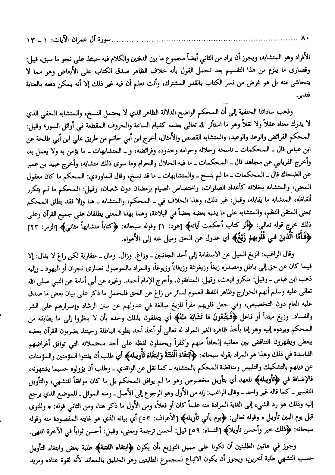 وذهب ساداتنا الحنفية إلى أن المحكم الواضح الدلالة الظاهر الذي لا يحتمل النسخ، والمتشابه الخفي الذي لا يدرك معناه عقلا ولا نقلا وهو ما استأثر الله تعالى بعلمه كقيام الساعة والحروف المقطعة في أوائل السور وقيل: