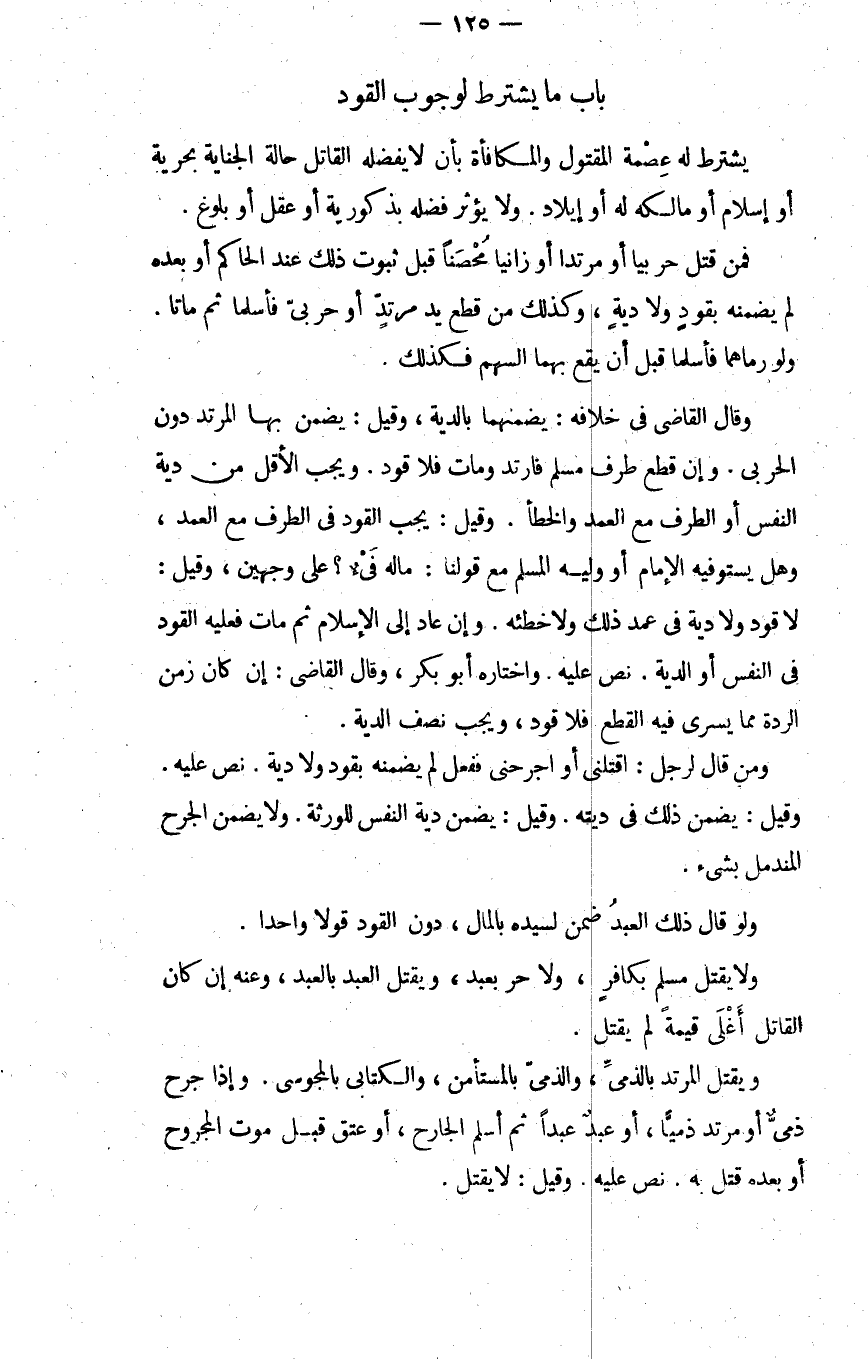 يشترط له عصمة المقتول والمكافأة بأن لا يفضله القاتل حالة الجناية بحرية أو إسلام أو مالكه له أو إيلاد ولا يؤثر فضله بذكورية أو عقل أو بلوغ.