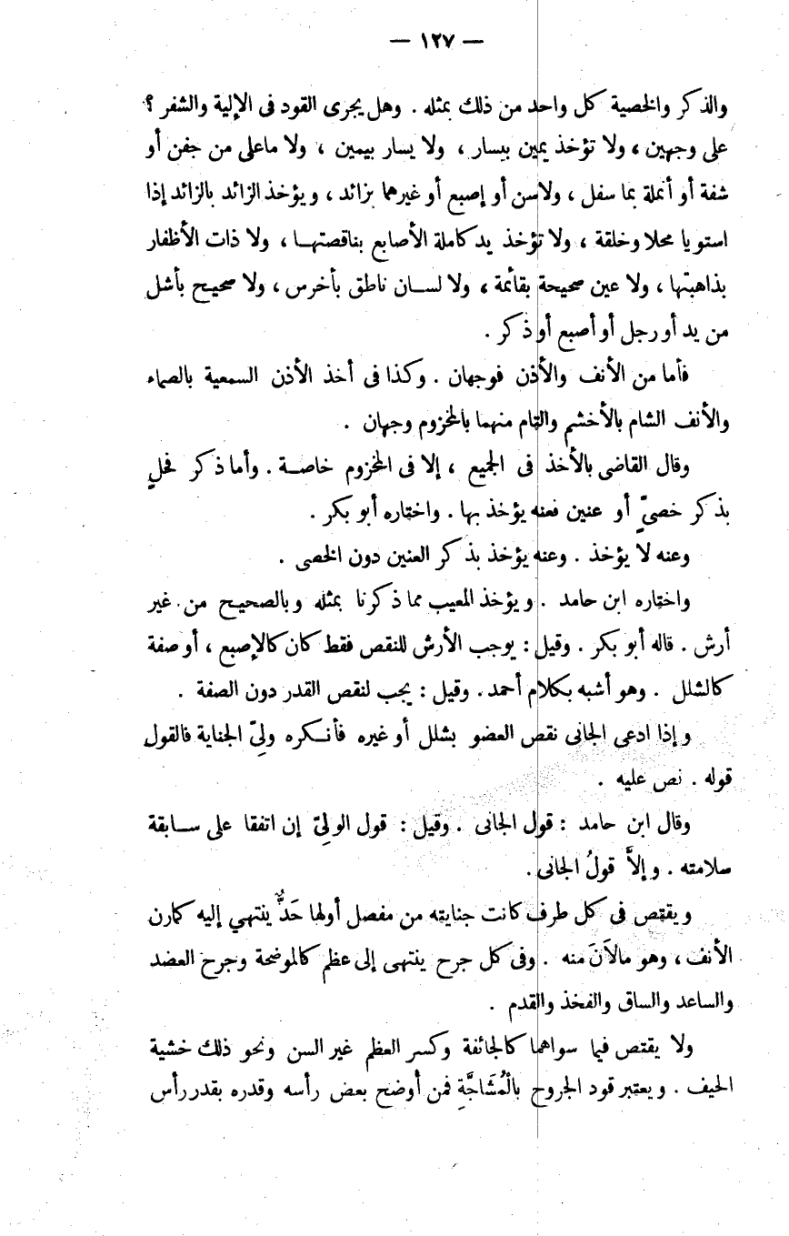 والذكر والخصية كل واحد من ذلك بمثله وهل يجري القود في الإلية والشغر على وجهين ولا تؤخذ يمين بيسار ولا يسار بيمين ولا ما على من جفن أو شفة أو أنملة بما سفل ولا سن أو أصبع أو غيرهما بزائد ويؤخذ الزائد بالزائد إذا استويا محلا وخلقة ولا تؤخذ يد كاملة الأصابع بناقصتها ولا ذات الأظفار بذاهبتها ولا عين صحيحة بقائمة ولا لسان ناطق بأخرس ولا صحيح بأشل من يد أو رجل أو أصبع أو ذكر.