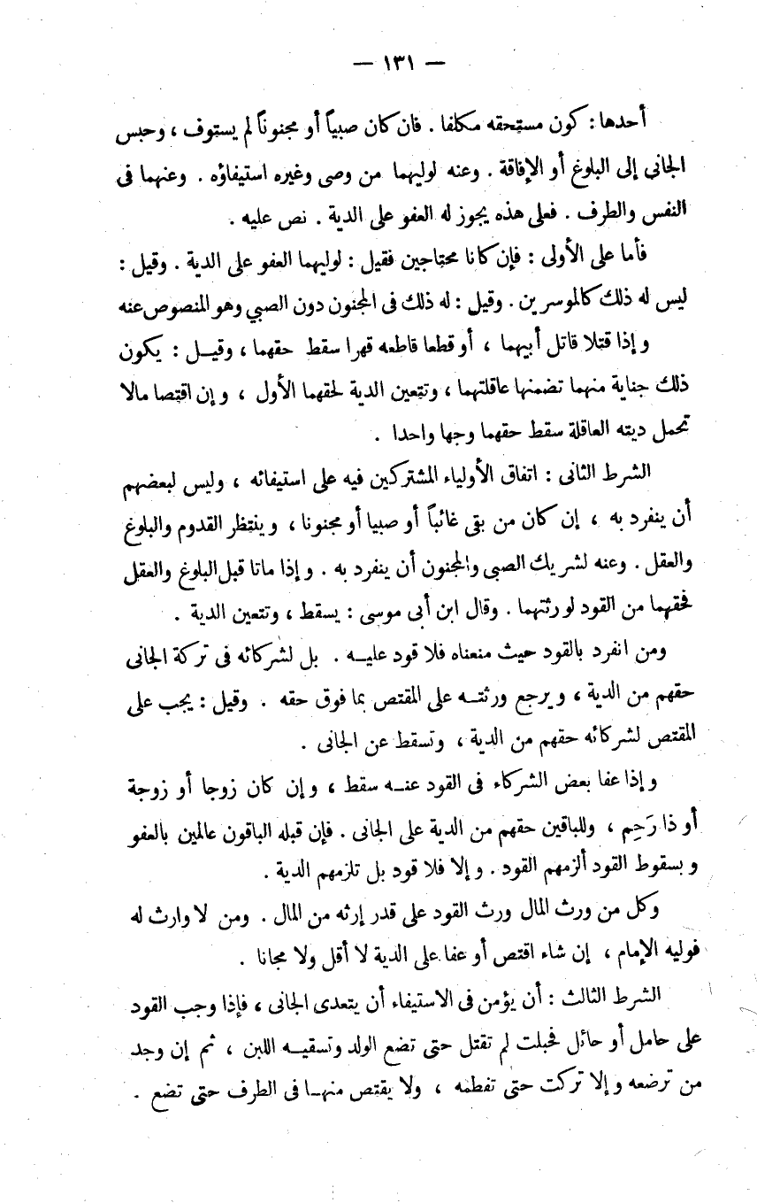 الشرط الثاني اتفاق الأولياء المشتركين فيه على استيفائه وليس لبعضهم أن ينفرد به إن كان من بقي غائبا أو صبيا أو مجنونا وينتظر القدوم والبلوغ والعقل وعنه لشريك الصبي والمجنون أن ينفرد به وإذا ماتا قبل البلوغ والعقل فحقهما من القود لورثتهما وقال ابن أبي موسى يسقط وتتعين الدية.