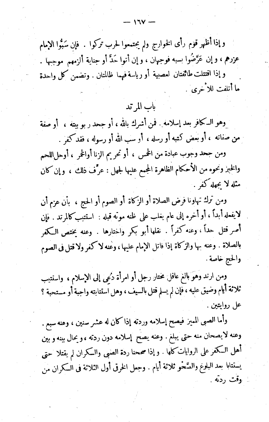 ومن ارتد وهو بالغ عاقل مختار رجل أو امرأة دعي إلى الإسلام واستتيب ثلاثة أيام وضيق عليه فإن لم يسلم قتل بالسيف وهل استتابته واجبة أو مستحبة على روايتين.