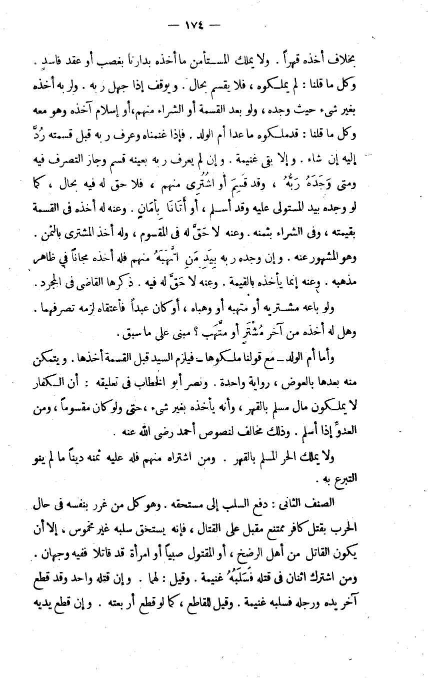 الصنف الثاني دفع السلب إلى مستحقه وهو كل من غرر بنفسه في حال الحرب بقتل كافر ممتنع مقبل على القتال فإنه يستحق سلبه غير مخموس إلا أن يكون القاتل من أهل الرضخ أو المقتول صبيا أو امرأة فقد قاتلا ففيه وجهان ومن اشترك اثنان في قتله فسلبه غنيمة وقيل لهما وإن قتله واحد وقد قطع آخر يده ورجله فسلبه غنيمة وقيل للقاطع كما لو قطع أربعته وإن قطع يديه