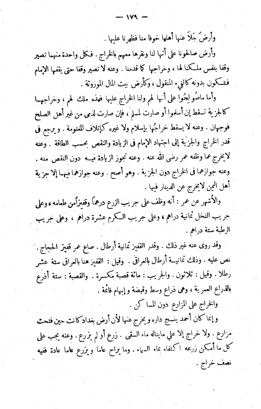 وإنما كان أحمد ينسج داره ويخرج عنها لأن أرض بغداد كانت حين فتحت مزارع ولا خراج إلا علي ما يناله ماء السقي زرع أو لم يزرع وعنه يجب على كل ما أمكن زرعه اكتفاء بماء السماء وما يراح عاما ويزرع عاما عادة ففيه نصف خراج.