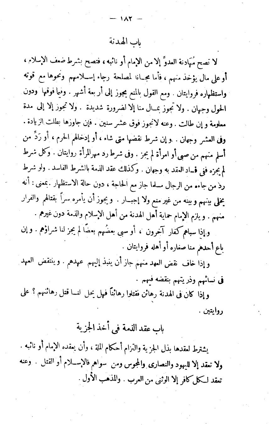 لا تصح مهادنة العدو إلا من الإمام أو نائبه فتصح بشرط ضعف الإسلام أو على مال يؤخذ منهم فأما مجانا لمصلحة رجاء إسلامهم ونحوها مع قوته واستظهاره فروايتان ومع القول بالمنع يجوز إلى أربعة أشهر وفيما فوقها ودون الحول وجهان ولا تجوز بمال منا إلا لضرورة شديدة ولا تجوز إلا إلى مدة معلومة وإن طالت وعنه لا تجوز فوق عشر سنين فإن جاوزها بطلت الزيادة وفي العشر وجهان وإن شرط نقضها متى شاء أو إدخالهم الحرم أو رد من أسلم منهم من صبي أو امرأة لم يجز وفي شرط رد مهر المرأة روايتان وكل شرط لم يجزه ففي فساد العقد به وجهان وكذلك عقد الذمة بالشرط الفاسد ولو شرط رد من جاءه من الرجال مسلما جاز مع الحاجة دون حالة الاستظهار بمعنى أنه يخلي بينهم وبينه من غير منع ولا إجبار ويجوز أن يأمره سرا بقتالهم والفرار منهم ويلزم الإمام حماية أهل الهدنة من أهل الإسلام والذمة دون غيرهم.
