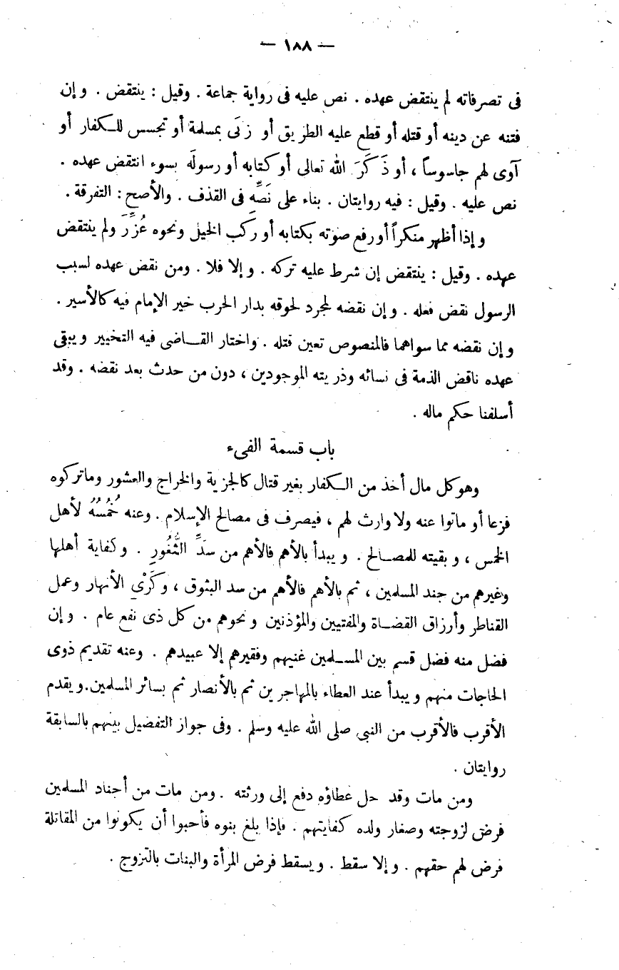 وهو كل مال أخذ من الكفار بغير قتال كالجزية والخراج والعشور وما تركوه فزعا أو ماتوا عنه ولا وارث لهم فيصرف في مصالح الإسلام وعنه خمسه لأهل الخمس وبقيته للمصالح ويبدأ بالأهم فالأهم من سد الثغور وكفاية أهلها وغيرهم من جند المسلمين ثم بالأهم فالأهم من سد البثوق وكرى الأنهار وعمل القناطر وأرزاق القضاة والمفتيين والمؤذنين ونحوهم من كل ذي نفع عام وإن فضل منه فضل قسم بين المسلمين غنيهم وفقيرهم إلا عبيدهم وعنه تقديم ذوي الحاجات منهم ويبدأ عند العطاء بالمهاجرين ثم بالأنصار ثم بسائر المسلمين ويقدم الأقرب فالأقرب من النبي صلى الله عليه وسلم وفي جواز التفضيل بينهم بالسابقة روايتان.