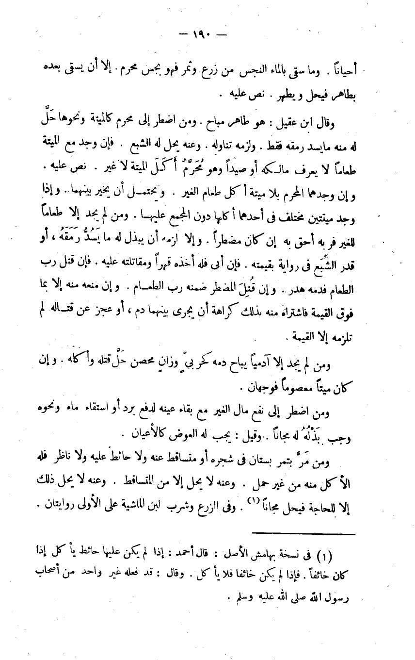 وقال ابن عقيل هو طاهر مباح ومن اضطر إلى محرم كالميتة ونحوها حل له منه ما يسد رمقة فقط ولزمه تناوله وعنه يحل له الشبع فإن وجد مع الميتة طعاما لا يعرف مالكه أو صيدا وهو محرم أكل الميتة لا غير نص عليه وإن وجدهما المحرم بلا ميتة أكل طعام الغير ويحتمل أن يخير بينهما وإذا وجد ميتتين مختلف في أحدهما أكلها دون المجمع عليها ومن لم يجد إلا طعاما للغير فربه أحق به إن كان مضطرا وإلا لزمه أن يبذل له ما يسد رمقه أو قدر الشبع في رواية بقيمته فإن أبى فله أخذه قهرا ومقاتلته عليه فإن قتل رب الطعام فدمه هدر وإن قتل المضطر ضمنه رب الطعام وإن منعه منه إلا بما فوق القيمة فاشتراه منه بذلك كراهة أن يجري بينهما دم أو عجز عن قتاله لم تلزمه إلا القيمة.