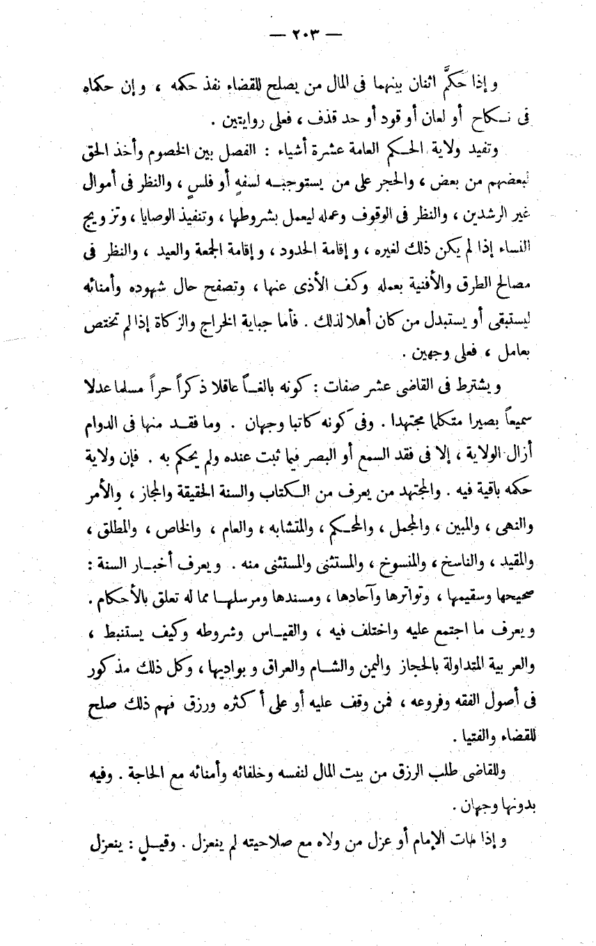 وتقيد ولاية الحكم العامة عشرة أشياء الفصل بين الخصوم وأخذ الحق لبعضهم من بعض والحجر على من يستوجبه لسفه أو فلس والنظر في أموال غير الرشدين والنظر في الوقوف وعمله ليعمل بشروطها وتنفيذ الوصايا وتزويج النساء إذا لم يكن ذلك لغيره وإقامة الحدود وإقامة الجمعة والعيد والنظر في مصالح الطرق والأفنية بعمله وكف الأذى عنها وتصفح حال شهوده وأمنائه ليستبقى أو يستبدل من كان أهلا لذلك فأما جباية الخراج والزكاة إذا لم تختص بعامل فعلى وجهين.