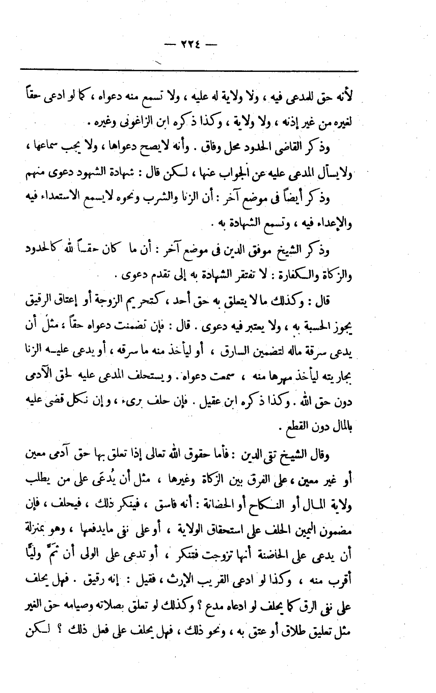 وقال الشيخ تقي الدين فأما حقوق الله تعالى إذا تعلق بها حق آدمي معين أو غير معين على الفرق بين الزكاة وغيرها مثل أن يدعى على من يطلب ولاية المال أو النكاح أو الحضانة أنه فاسق فينكر ذلك فيحلف فإن مضمون اليمين الحلف على استحقاق الولاية أو على نفي ما يدفعها وهو بمنزلة أن يدعى على الحاضنة أنها تزوجت فتنكر أو تدعى على الولي أن ثم وليا أقرب منه وكذا لو ادعى القريب الإرث فقيل إنه رقيق فهل يحلف على نفي الرق كما يحلف لو ادعاه مدع وكذلك لو تعلق بصلاته وصيامه حق الغير مثل تعليق طلاق أو عتق به ونحو ذلك فهل يحلف على فعل ذلك لكن