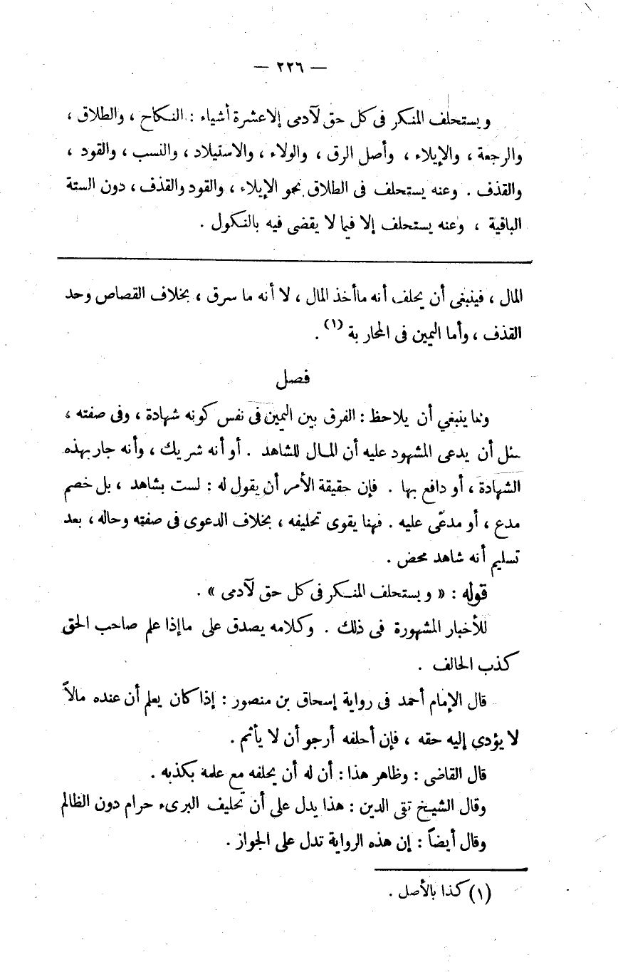 ويستحلف المنكر في كل حق لآدمي إلا عشرة أشياء النكاح والطلاق والرجعة والإيلاء وأصل الرق والولاء والاستيلاد والنسب والقود والقذف وعنه يستحلف في الطلاق نحو الإيلاء والقود والقذف دون الستة الباقية وعنه يستحلف إلا فيما لا يقضي فيه بالنكول.