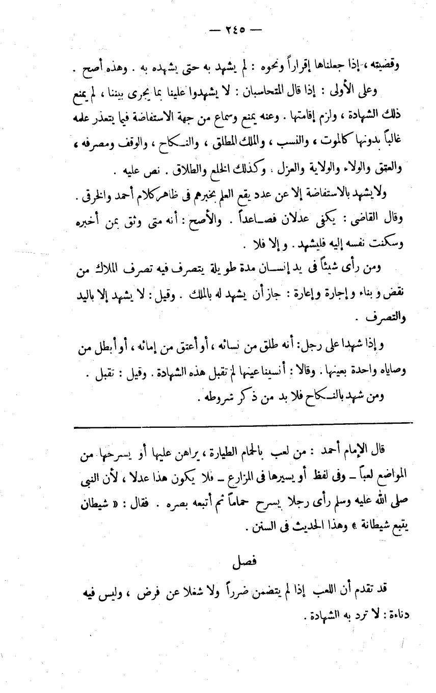 قال الإمام أحمد من لعب بالحمام الطيارة يراهن عليها أو يسرحها من المواضع لعبا وفي لفظ أو يسيرها في المزارع فلا يكون هذا عدلا لأن النبي صلى الله عليه وسلم رأى رجلا يسرح حماما ثم أتبعه بصره فقال "شيطان يتبع شيطانة" وهذا الحديث في السنن.