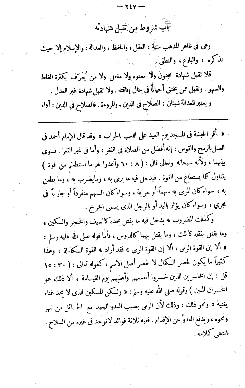 "أقر الحبشة في المسجد يوم العيد على اللعب بالحراب" وقد قال الإمام أحمد في العمل بالرمح والقوس إنه أفضل من الصلاة في الثغر وأما في غير الثغر فسوى بينهما ولأنه سبحانه وتعالى قال: [60:8] {وَأَعِدُّوا لَهُمْ مَا اسْتَطَعْتُمْ مِنْ قُوَّةٍ} يتناول كلما يستطاع من القوة فيدخل فيه ما يرمى به وما يضرب به وما يطعن به سواء كان المرمى به سهما أو حربة وسواء كان السهم منفردا أو جاريا في مجري وسواء كان يؤثر باليد أو بالرجل الذي يسمى الجرخ.