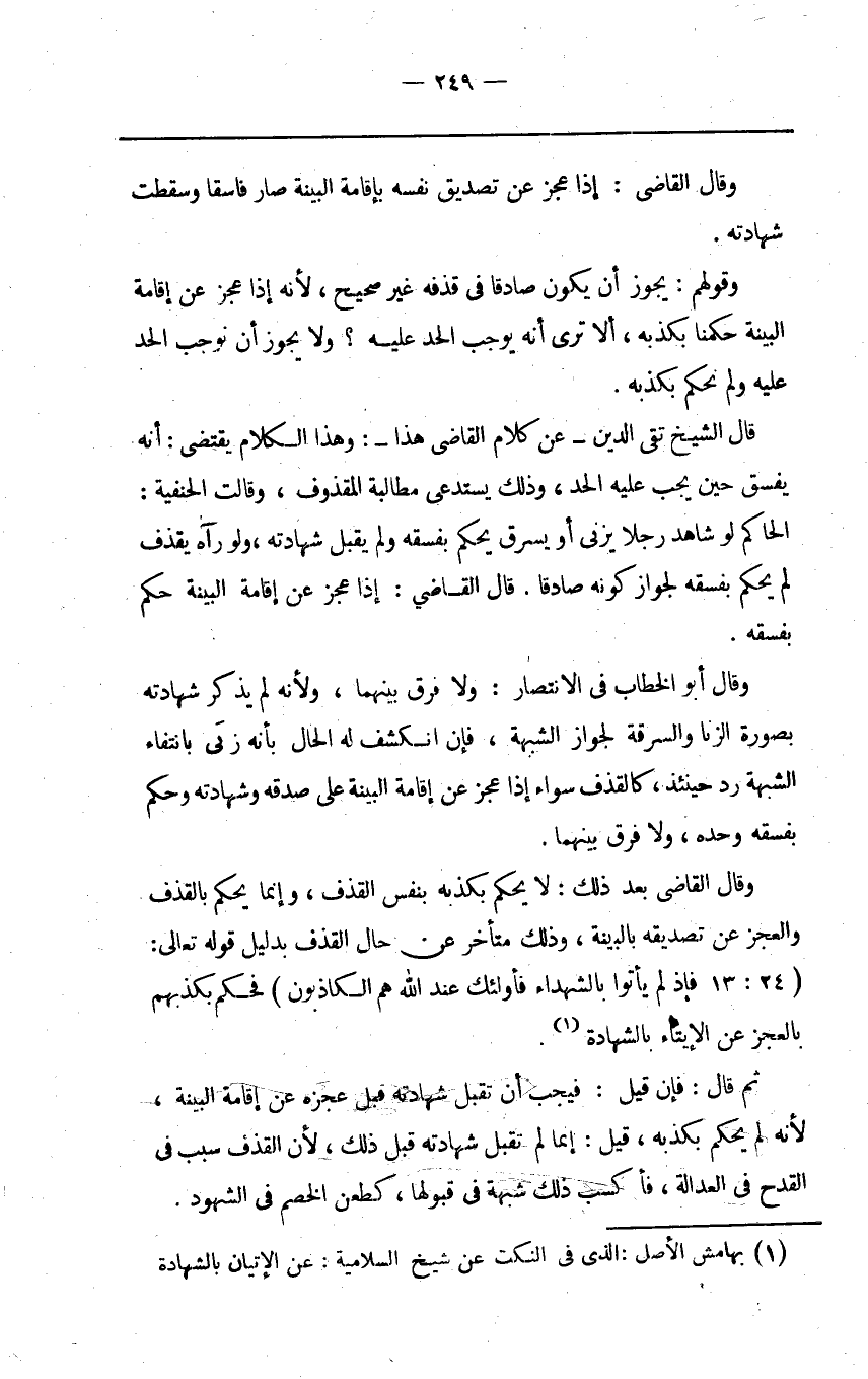 وقال القاضي بعد ذلك لا يحكم بكذبه بنفس القذف وإنما يحكم بالقذف والعجز عن تصديقه بالبينة وذلك متأخر عن حال القذف بدليل قوله تعالى: [13:24] {فَإِذْ لَمْ يَأْتُوا بِالشُّهَدَاءِ فَأُولَئِكَ عِنْدَ اللَّهِ هُمُ الْكَاذِبُونَ} فحكم بكذبهم بالعجز عن الإيتاء بالشهادة1.