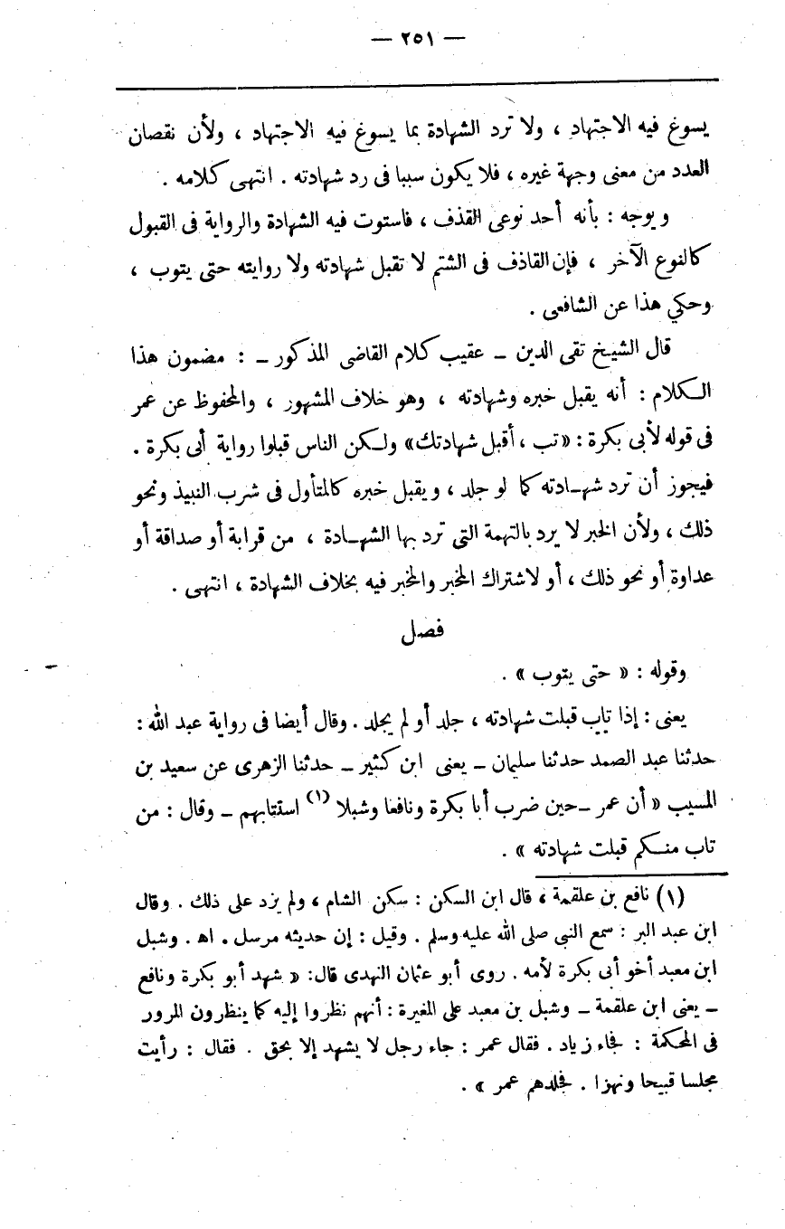 يعني إذا تاب قبلت شهادته جلد أو لم يجلد وقال أيضا في رواية عبد الله حدثنا عبد الصمد حدثنا سليمان يعني ابن كثير حدثنا الزهري عن سعيد بن المسيب "أن عمر حين ضرب أبا بكرة ونافعا وشبلا1 استتابهم وقال من تاب منكم قبلت شهادته".