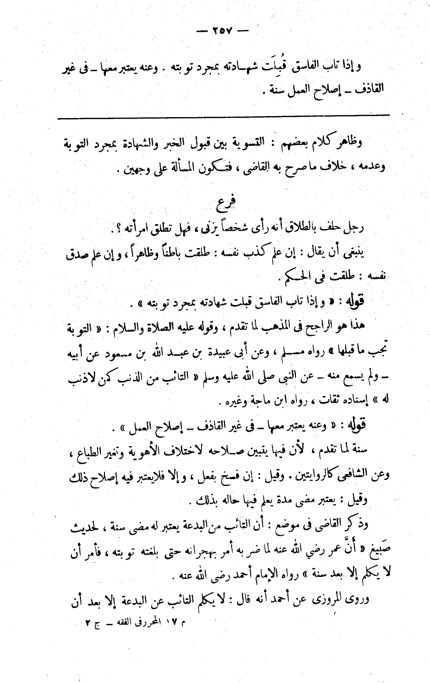 وإذا تاب الفاسق قبلت شهادته بمجرد توبته وعنه يعتبر معها في غير القاذف إصلاح العمل سنة.