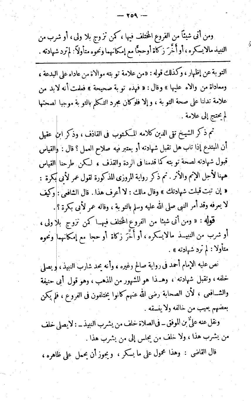 ثم ذكر الشيخ تقي الدين كلامه المكتوب في القاذف وذكر ابن عقيل أن المبتدع إذا تاب هل تقبل شهادته أو يعتبر به صلاح العمل قال والقياس قبول شهادته لصحة توبته كما قدمناه في الردة والقذف لكن طرحنا القياس ههنا لأجل الإثم والأثر ثم ذكر رواية المروزي المذكورة لقول عمر لأبي بكرة "إن تبت قبلت شهادتك" وقال مالك لا أعرف هذا قال الشافعي وكيف لا يعرفه وقد أمر النبي صلى الله عليه وسلم بالتوبة وقاله عمر لأبي بكرة.