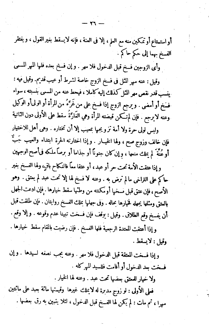 وإذا عتقت الأمة تحت حر أو عبد أو عتقا معا فالنكاح باق ولها الفسخ بغير حاكم على التراخي مالم ترض به وعنه لا فسخ لها إلا تحت عبد لم يعتق وهو الأصح فإن عتق قبل فسخها أو مكنته من وطئها سقط خيارها فإن ادعت الجهل بالعتق ومثلها يجعله فخيارها بحاله وفي جهلها يملك الفسخ روايتان فإن طلقت قبل أن يفسخ وقع الطلاق وقيل يوقف فإن فسخت تبينا عدم وقوعه وإلا وقع.