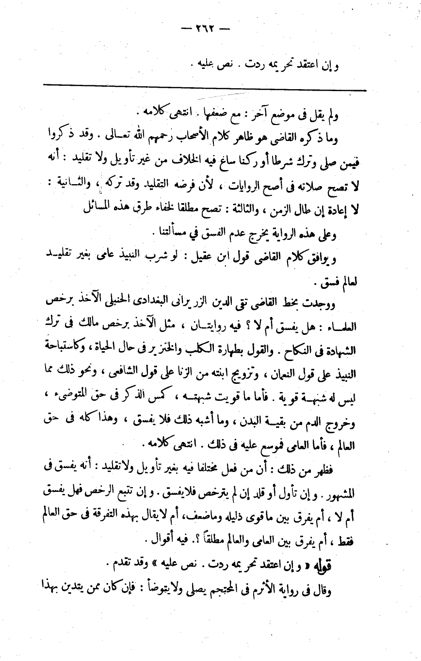 وما ذكره القاضي هو ظاهر كلام الأصحاب رحمهم الله تعالى وقد ذكروا فيمن صلى وترك شرطا أو ركنا ساغ فيه الخلاف من غير تأويل ولا تقليد أنه لا تصح صلاته في أصح الروايات لأن فرضه التقليد وقد تركه والثانية لا إعادة إن طال الزمن والثالثة تصح مطلقا لخفاء طرق هذه المسائل وعلى هذه الرواية يخرج عدم الفسق في مسألتنا.