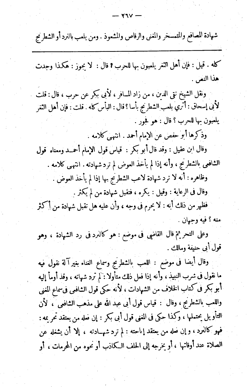 ونقل الشيخ تقي الدين من زاد المسافر لأبي بكر عن حرب قال قلت لأبي إسحاق أترى بلعب الشطرنج بأسا قال البأس كله قلت فإن أهل الثغر يلعبون بها للحرب قال هو فجور.