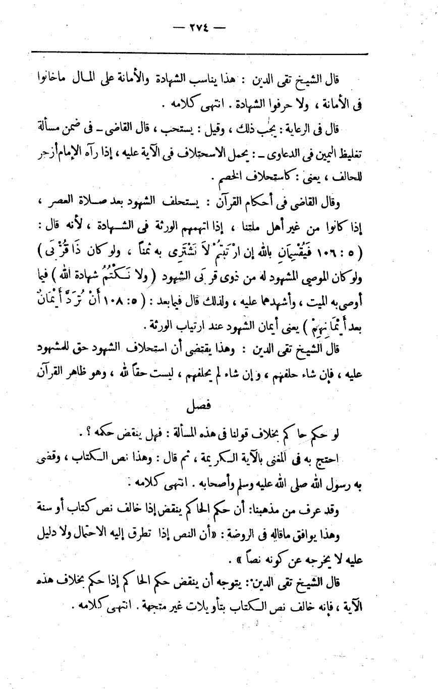 قال الشيخ تقي الدين يتوجه أن ينقض حكم الحاكم إذا حكم بخلاف هذه الآية فإنه خالف نص الكتاب بتأويلات غير متجهة انتهى كلامه.