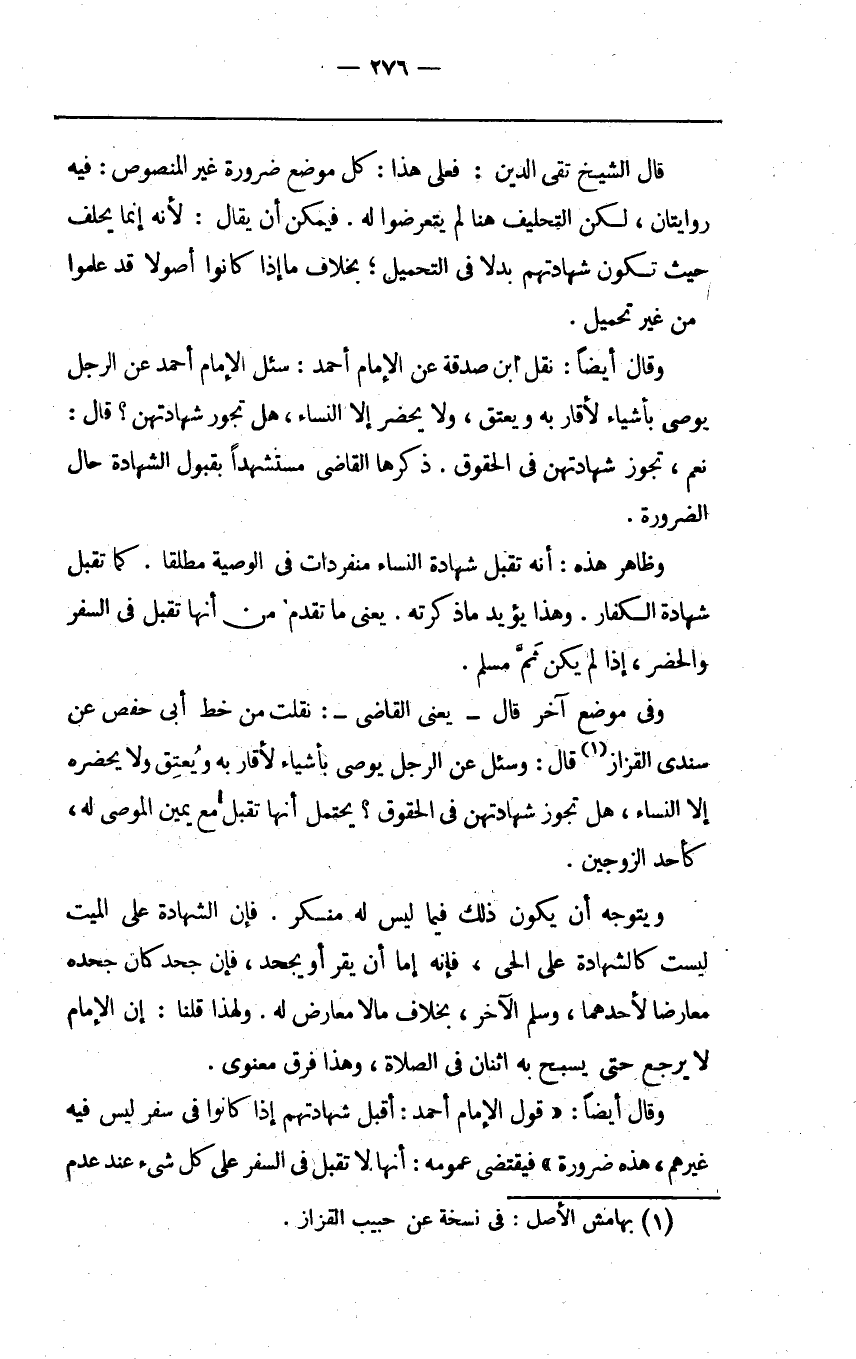 وقال أيضا نقل ابن صدقة عن الإمام أحمد سئل الإمام أحمد عن الرجل يوصي بأشياء لأقاربه ويعتق ولا يحضر إلا النساء هل تجوز شهادتهن قال نعم تجوز شهادتهن في الحقوق ذكرها القاضي مستشهدا بقبول الشهادة حال الضرورة.