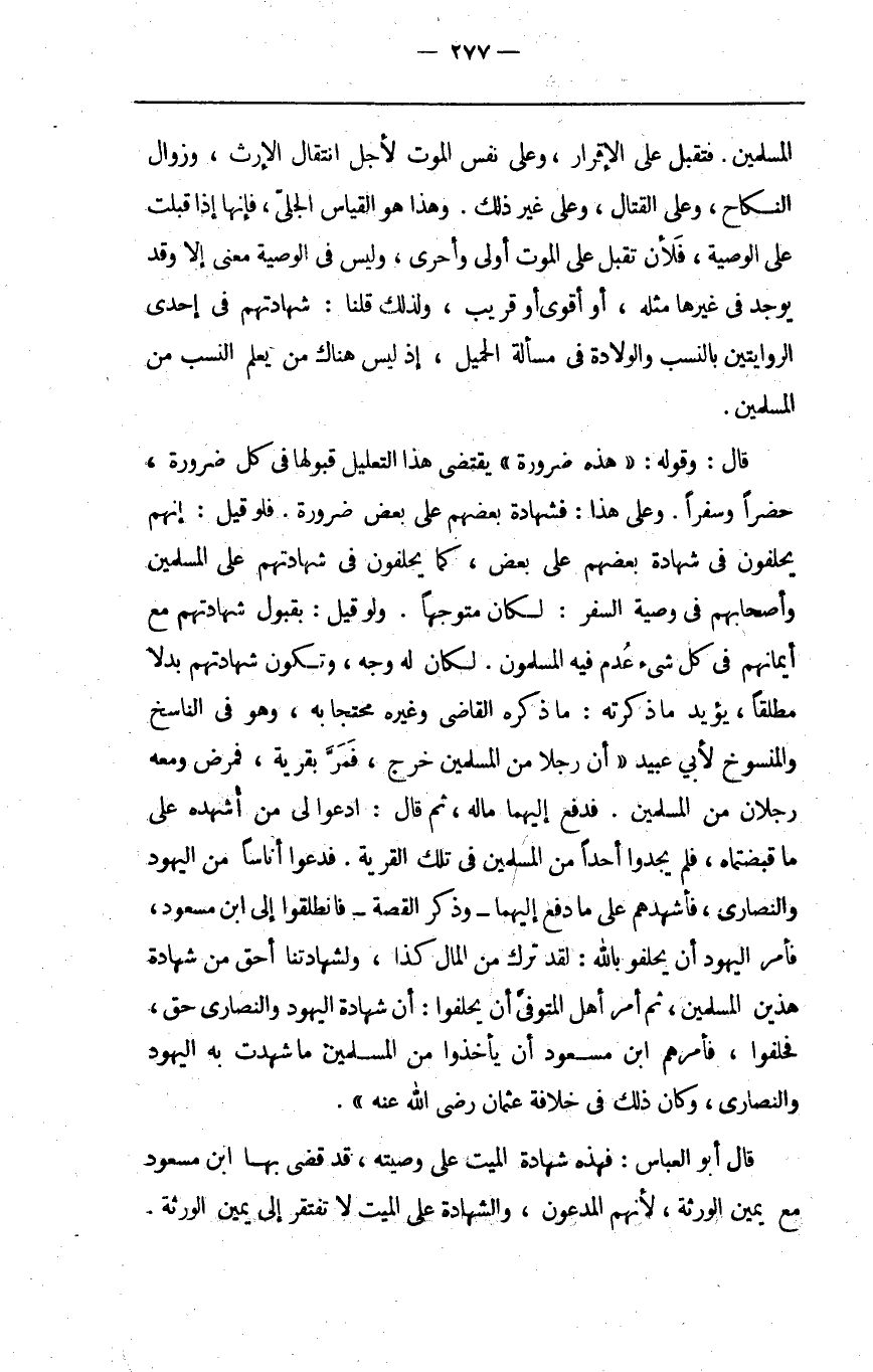 قال وقوله: "هذه ضرورة" يقتضى هذا التعليل قبولها في كل ضرورة حضرا وسفرا وعلى هذا فشهادة بعضهم على بعض ضرورة فلو قيل إنهم يحلفون في شهادة بعضهم على بعض كما يحلفون في شهادتهم على المسلمين وأصحابهم في وصية السفر لكان متوجها ولو قيل بقبول شهادتهم مع أيمانهم في كل شيء عدم فيه المسلمون لكان له وجه وتكون شهادتهم بدلا مطلقا يؤيد ما ذكرته ما ذكره القاضي وغيره محتجا به وهو في الناسخ والمنسوخ لأبي عبيد "أن رجلا من المسلمين خرج فمر بقرية فمرض ومعه رجلان من المسلمين فدفع إليهما ماله ثم قال ادعوا لي من أشهده على ما قبضتماه فلم يجدوا أحدا من المسلمين في تلك القرية فدعوا أناسا من اليهود والنصارى فأشهدهم على ما دفع إليهما وذكر القصة فانطلقوا إلى ابن مسعود فأمر اليهود أن يحلفوا بالله لقد ترك من المال كذا ولشهادتنا أحق من شهادة هذين المسلمين ثم أمر أهل المتوفى أن يحلفوا أن شهادة اليهود والنصارى حق فحلفوا فأمرهم ابن مسعود أن يأخذوا من المسلمين ما شهدت به اليهود والنصارى وكان ذلك في خلافة عثمان رضي الله عنه".
