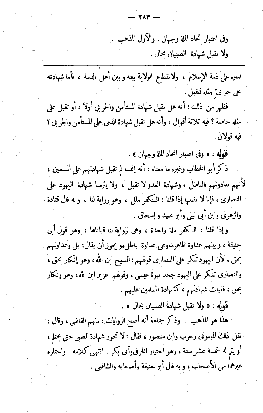 فظهر من ذلك أنه هل تقبل شهادة المستأمن والحربي أولا أو تقبل على مثله خاصة فيه ثلاثة أقوال وأنه هل تقبل شهادة الذمي على المستأمن والحربي فيه قولان.
