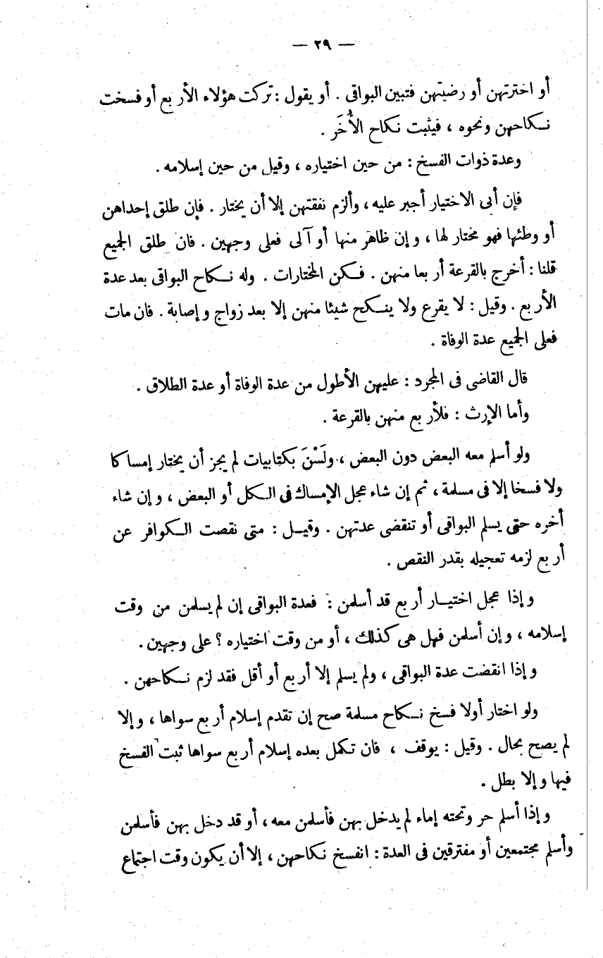 ولو أسلم معه البعض دون البعض ولسن بكتابيات لم يجز أن يختار إمساكا ولا فسخا إلا في مسلمة ثم إن شاء عجل الإمساك في الكل أو البعض وإن شاء أخره حتى يسلم البواقي أو تنقضي عدتهن وقيل متى نقصت الكوافر عن أربع لزمه تعجيله بقدر النقص.