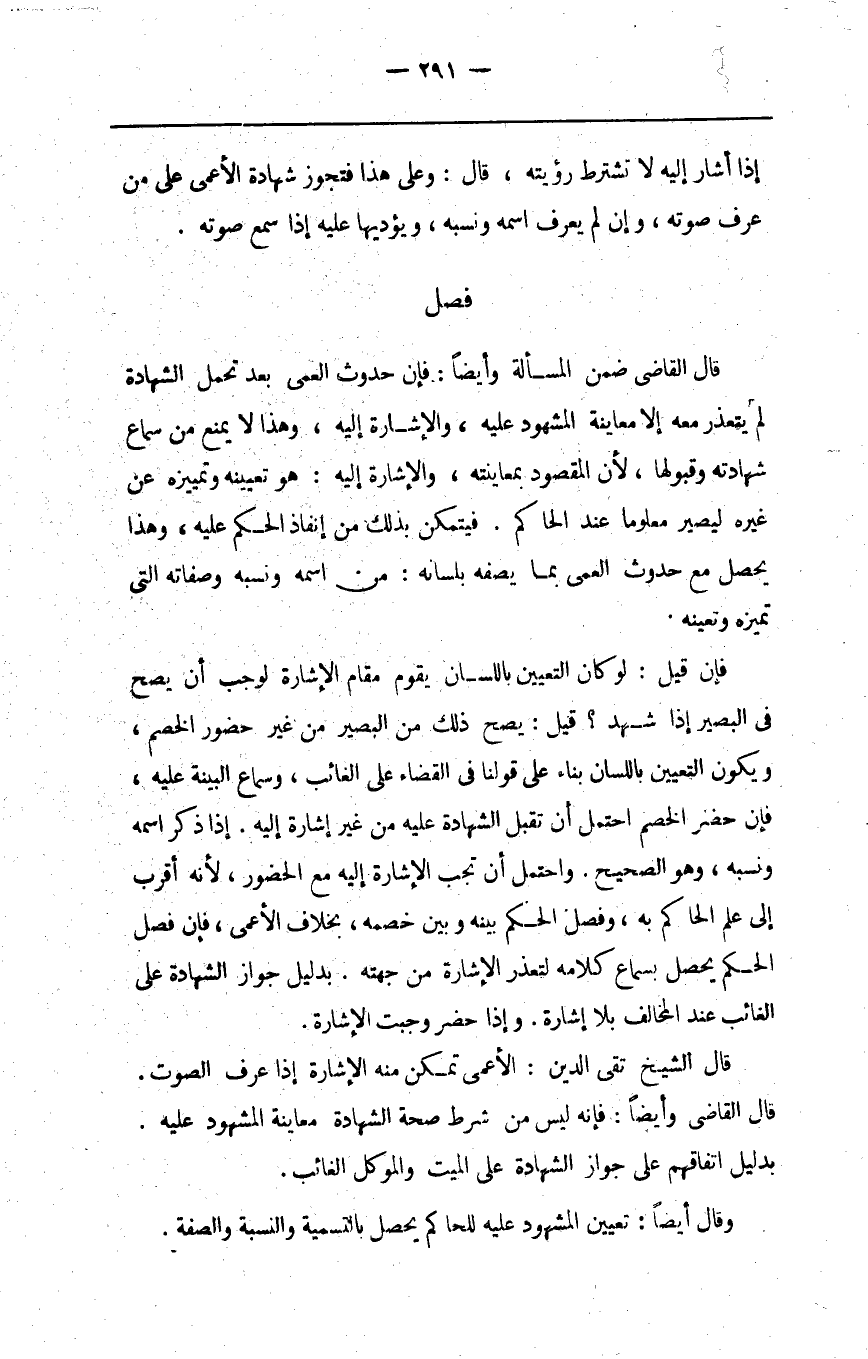 قال القاضي ضمن المسألة وأيضا فإن حدوث العمى بعد تحمل الشهادة لم يتعذر معه إلا معاينة المشهود عليه والإشارة إليه وهذا لا يمنع من سماع شهادته وقبولها لأن المقصود بمعاينته والإشارة إليه هو تعيينه وتمييزه عن غيره ليصير معلوما عند الحاكم فيتمكن بذلك من إنفاذ الحكم عليه وهذا يحصل مع حدوث العمى بما يصفه بلسانه من اسمه ونسبه وصفاته التي تميزه وتعينه.