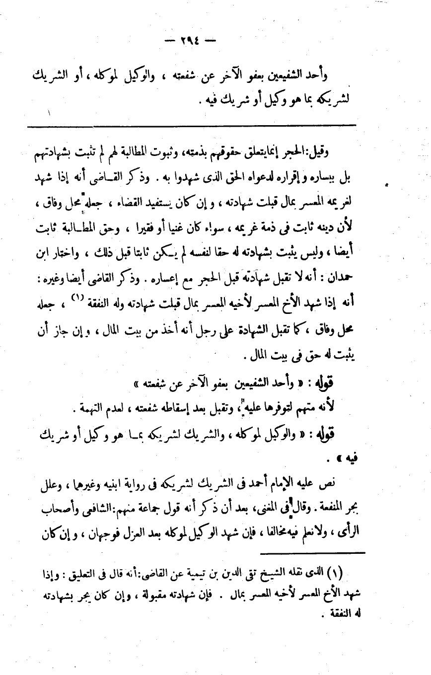1 الذي نقله الشيخ تقي الدين بن تيمية عن القاضي: أنه في التعليق: وإذا شهد الأخ المعسر لأخيه المعسر بمال. فإن شهادته مقبولة، وإن كان يجر بشهادته له النفقة.