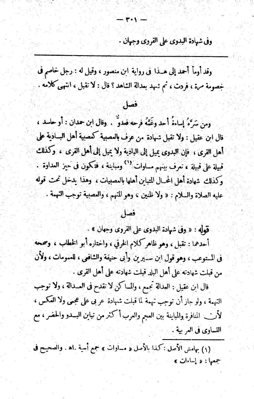 قال ابن عقيل العدالة تجمع والمساكن لا تقدح في العدالة ولا توجب التهمة ولو جاز أن توجب تهمة لما قبلت شهادة عربي على عجمي ولا العكس لأن المنافرة والمباينة بين العجم والعرب أكثر من تباين البدو والحضر مع التساوي في العربية.