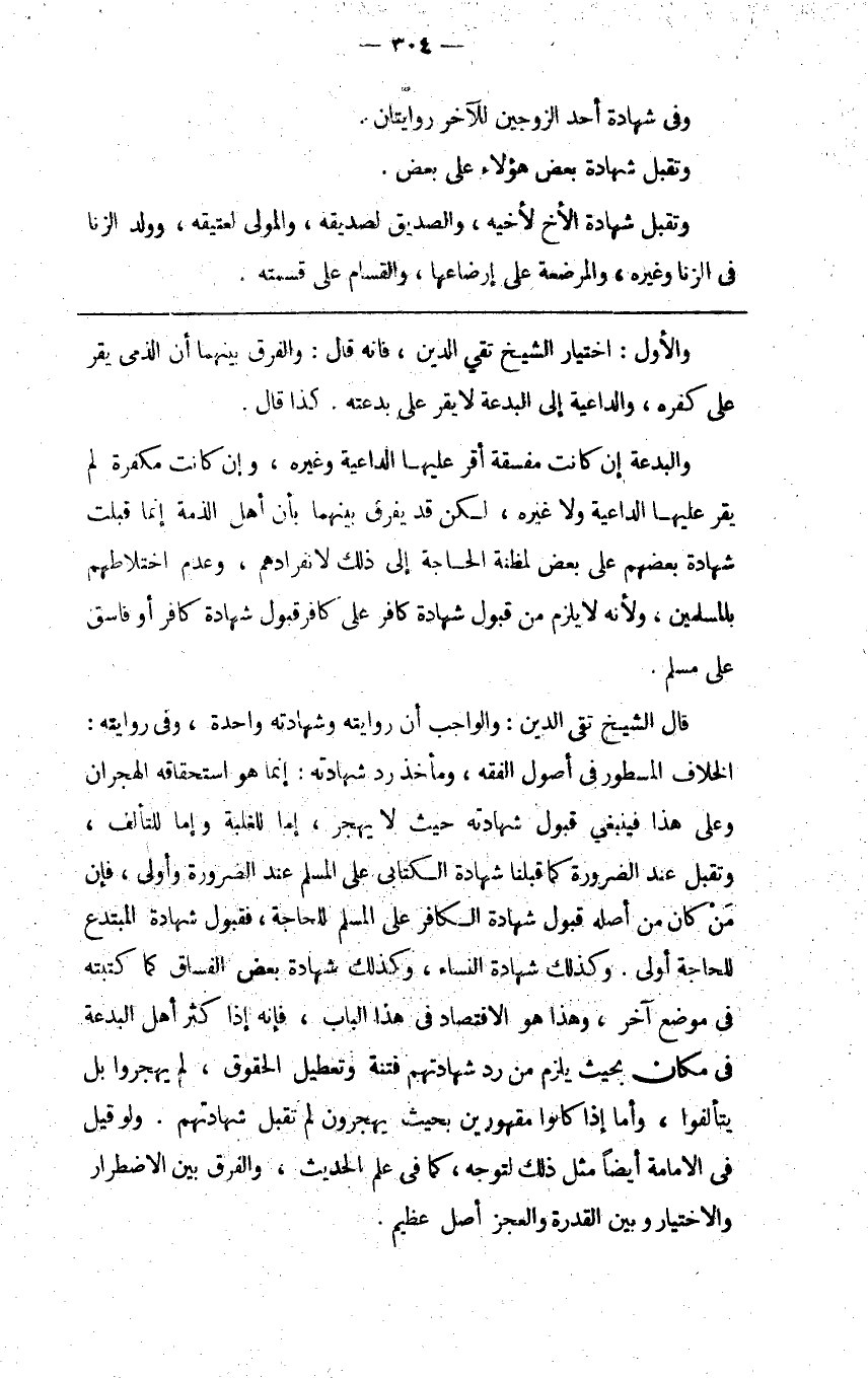 قال الشيخ تقي الدين والواجب أن روايته وشهادته واحدة وفي روايته الخلاف المسطور في أصول الفقه ومأخذ رد شهادته إنما هو استحقاقه الهجران وعلى هذا فينبغي قبول شهادته حيث لا يهجر إما للغلبة وإما للتألف وتقبل عند الضرورة كما قبلنا شهادة الكتابي على المسلم عند الضرورة وأولى فإن من كان من أصله قبول شهادة الكافر على المسلم للحاجة فقبول شهادة المبتدع للحاجة أولى وكذلك شهادة النساء وكذلك شهادة بعض الفساق كما كتبته في موضع آخر وهذا هو الاقتصاد في هذا الباب فإنه إذا كثر أهل البدعة في مكان بحيث يلزم من رد شهادتهم فتنة وتعطيل الحقوق لم يهجروا بل يتألفوا وأما إذا كانوا مقهورين بحيث يهجرون لم تقبل شهادتهم ولو قيل في الامامة أيضا مثل ذلك لتوجه كما في علم الحديث والفرق بين الاضطرار والاختيار بين القدرة والعجز أصل عظيم.