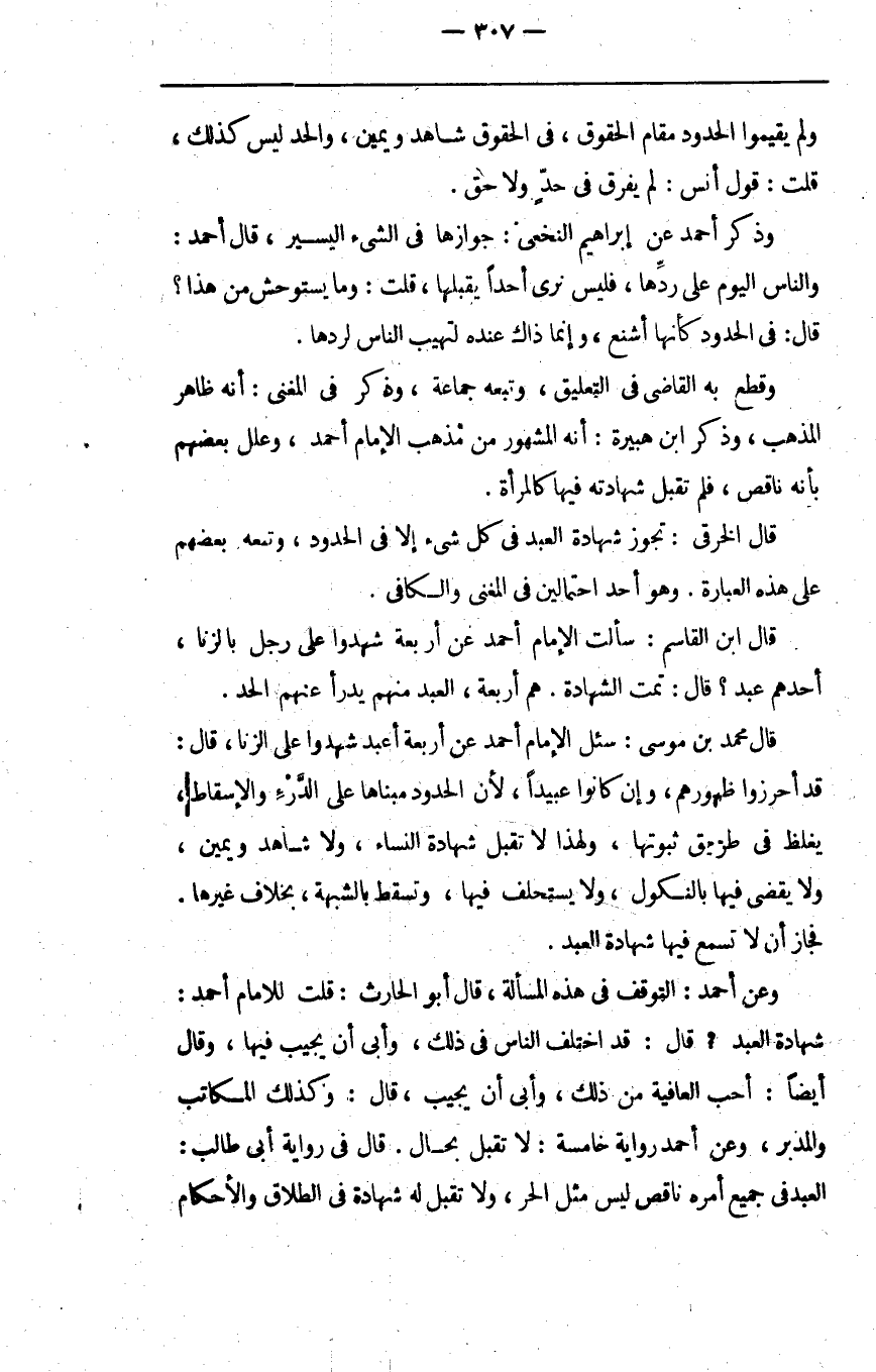 قال ابن القاسم سألت الإمام أحمد عن أربعة شهدوا على رجل بالزنا أحدهم عبد قال تمت الشهادة هم أربعة العبد منهم يدرأ عنهم الحد.