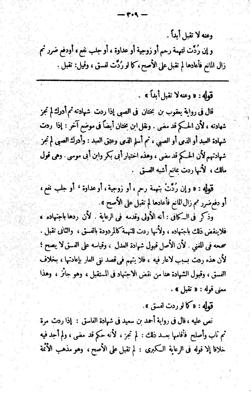 وذكر في الكافي أنه الأولى وقدمه في الرعاية لأن ردها باجتهاده فلا ينقض ذلك باجتهاده ولأنها ردت للتهمة كالمردودة بالفسق والثاني تقبل صححه في المغني لأن الأصل قبول شهادة العدل وقياسه على الفسق لا يصح لأن هذه ردت بسبب لا عار فيه فلا يتهم في قصد نفي العار بإعادتها بخلاف الفسق وقبول الشهادة هنا من نقض الاجتهاد في المستقبل وهو جائز وهذا معنى قوله: "تقبل".