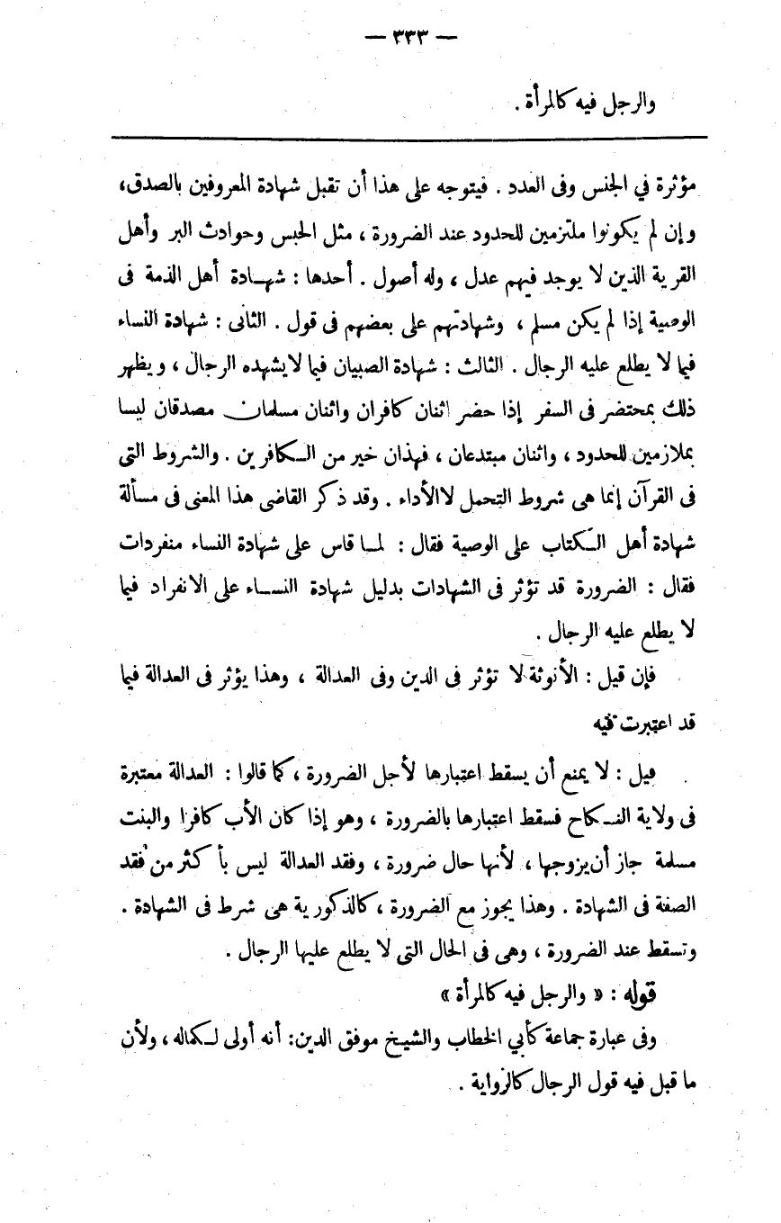 مؤثر في الجنس وفي العدد فيتوجه على هذا أن تقبل شهادة المعروفين بالصدق وإن لم يكونوا ملتزمين للحدود عند الضرورة مثل الحبس وحوادث البر وأهل القرية الذين لا يوجد فيهم عدل وله أصول أحدها شهادة أهل الذمة في الوصية إذا لم يكن مسلم وشهادتهم على بعضهم في قول الثاني شهادة النساء فيما لا يطلع عليه الرجال الثالث شهادة الصبيان فيما لا يشهده الرجال ويظهر ذلك بمحتضر في السفر إذا حضر إثنان كافران واثنان مسلمان مصدقان ليسا بملازمين للحدود واثنان مبتدعان فهذان خير من الكافرين والشروط التي في القرآن إنما هي شروط التحمل لا الأداء وقد ذكر القاضي هذا المعنى في مسألة شهادة أهل الكتاب على الوصية فقال لما قاس على شهادة النساء منفردات فقال الضرورة قد تؤثر في الشهادات بدليل شهادة النساء على الإنفراد فيما لا يطلع عليه الرجال.