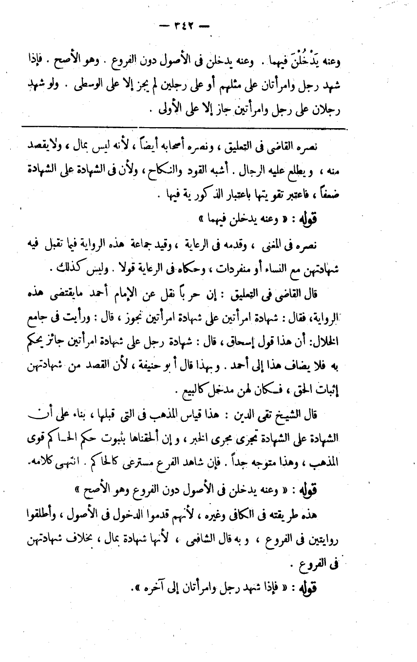وعنه يدخلن فيهما وعنه يدخلن في الأصول دون الفروع وهو الأصح فإذا شهد رجل وامرأتان على مثلهم أو على رجلين لم يجز إلا على الوسطى ولو شهد رجلان على رجل وامرأتين جاز إلا على الأولى.