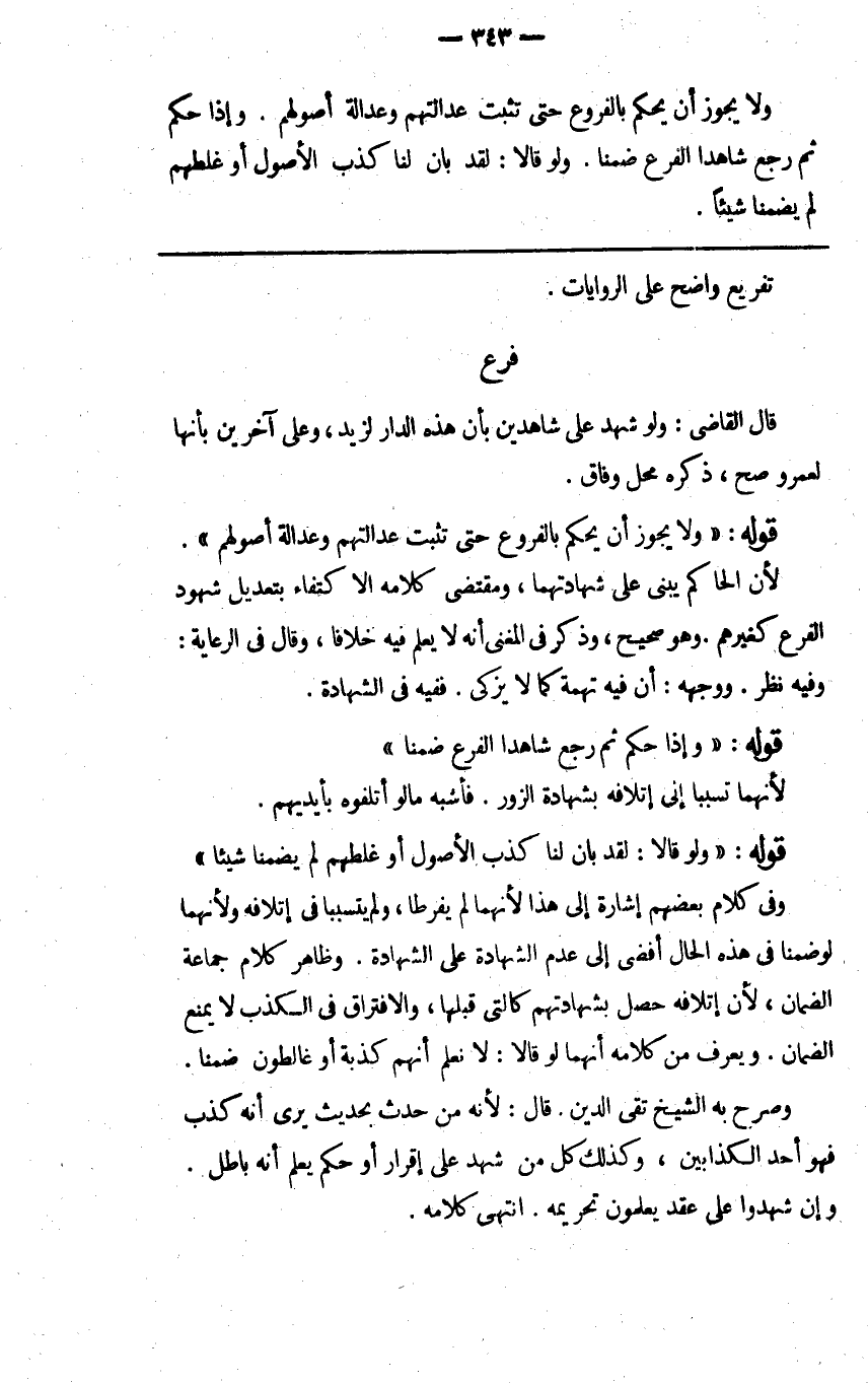 ولا يجوز أن يحكم بالفروع حتى تثبت عدالتهم وعدالة أصولهم وإذا حكم ثم رجع شاهدا الفرع ضمنا ولو قالا لقد بان لنا كذب الأصول أو غلطهم لم يضمنا شيئا.