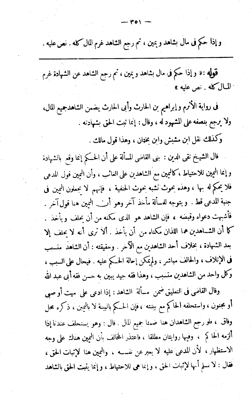 وقال القاضي في التعليق ضمن مسألة الشاهد إذا ادعى على ميت أو صبي أو مجنون واستحلفه الحاكم مع بينته فإن الحكم بالبينة لا باليمين ذكره محل وفاق فلو رجع الشاهدان هنا ضمنا جميع المال قال وهو يستحلف عندنا إذا ألزمه الحاكم وفيها روايتان مطلقا فاعتذر المخالف بأن اليمين هناك على وجه الاستظهار لأن المدعى عليه لا يعبر عن نفسه واليمين هنا لإثبات الحق فقال لا نسلم أنها لإثبات الحق وإنما هي للاحتياط وإنما يثبت الحق بالشاهد
