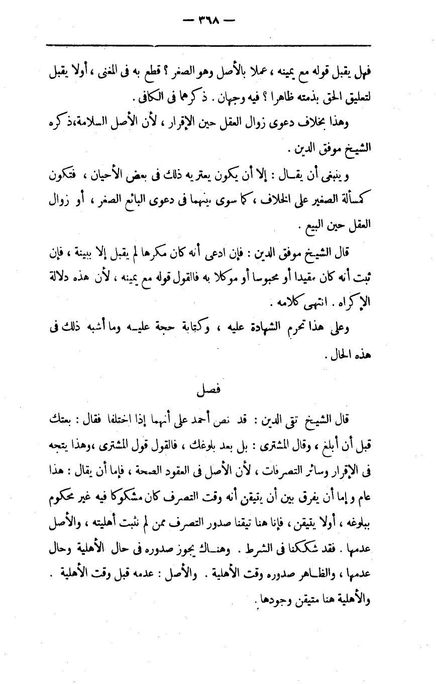 قال الشيخ تقي الدين قد نص أحمد على أنهما إذا اختلفا فقال بعتك قبل أن أبلغ وقال المشتري بل بعد بلوغك فالقول قول المشتري وهذا يتجه في الإقرار وسائر التصرفات لأن الأصل في العقود الصحة فإما أن يقال هذا عام وإما أن يفرق بين أن يتيقن أنه وقت التصرف كان مشكوكا فيه غير محكوم ببلوغه أولا يتيقن فإنا هنا تيقنا صدور التصرف ممن لم نثبت أهليته والأصل عدمها فقد شككنا في الشرط وهناك يجوز صدوره في حال الأهلية وحال عدمها والظاهر صدره وقت الأهلية والأصل عدمه قبل وقت الأهلية والأهلية هنا متيقن وجودها.