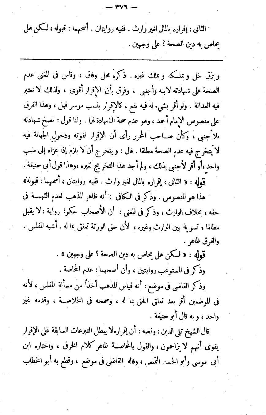 الثاني إقراره بالمال لغير وارث ففيه روايتان أصحهما قبوله لكن هل يحاص به دين الصحة على وجهين.