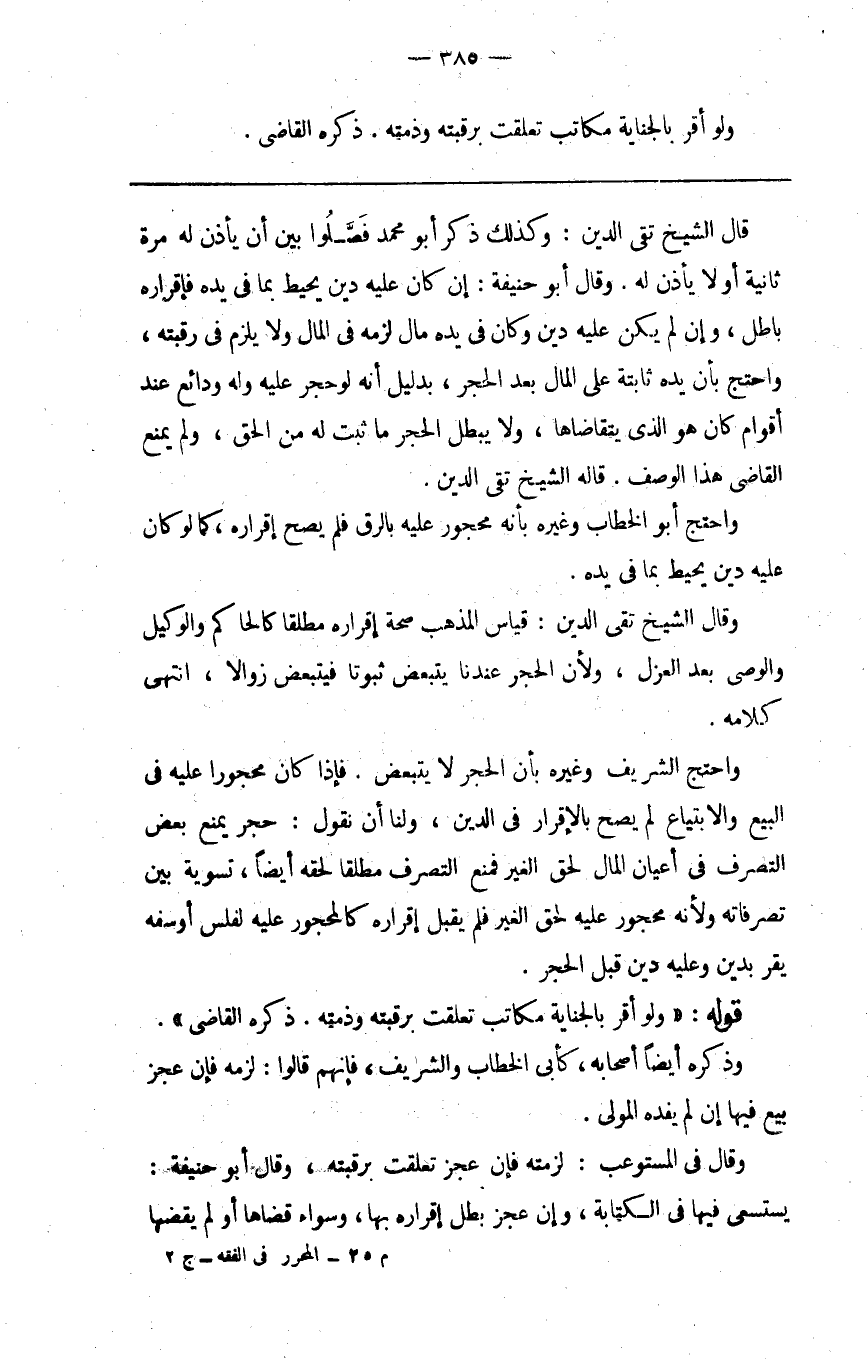 قال الشيخ تقي الدين وكذلك ذكر أبو محمد فصلوا بين أن يأذن له مرة ثانية أو لا يأذن له وقال أبو حنيفة إن كان عليه دين يحيط بما في يده فإقراره باطل وإن لم يكن عليه دين وكان في يده مال لزمه في المال ولا يلزم في رقبته واحتج بأن يده ثابتة على المال بعد الحجر بدليل أنه لو حجر عليه وله ودائع عند أقوام كان هو الذي يتقاضاها ولا يبطل الحجر ما ثبت له من الحق ولم يمنع القاضي هذا الوصف قاله الشيخ تقي الدين.