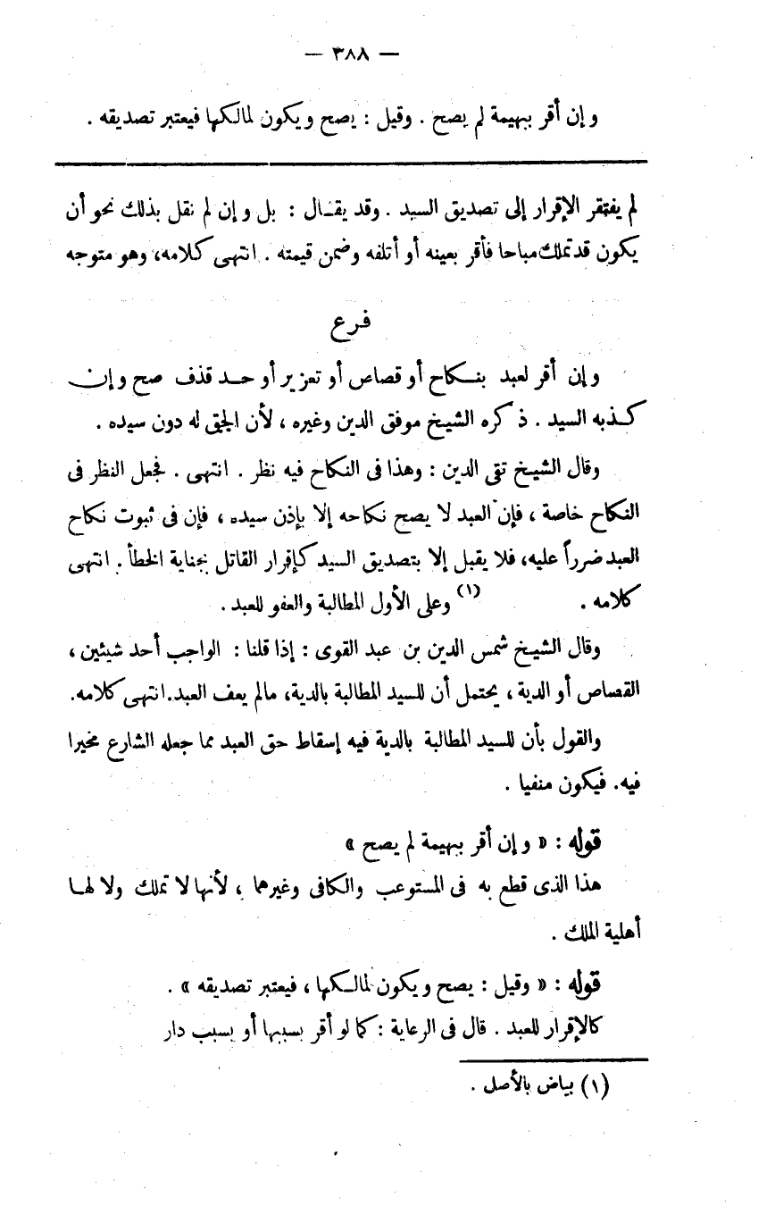 وقال الشيخ تقي الدين وهذا في النكاح فيه نظر انتهى فجعل النظر في النكاح خاصة فإن العبد لا يصح نكاحه إلا بإذن سيده فإن في ثبوت نكاح العبد ضررا عليه فلا يقبل إلا بتصديق السيد كإقرار القاتل بجناية الخطأ انتهى كلامه. 1 وعلى الأول المطالبة والعفو للعبد.