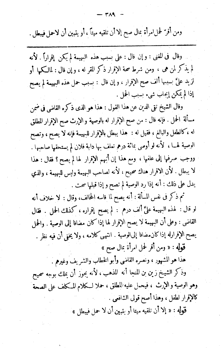 ثم ذكر في نفس المسألة أنه يصح لما قاسه المخالف وقال لا خلاف أنه لو قال لهذه البهيمة على ألف درهم لم يصح إقراره كذلك الحمل فقال القاضي وعلى أن البهيمة لا يصح الإقرار لها إذا كان مضافا إلى الوصية والحمل يصح الإقرار له إذا كان مضافا إلى الوصية انتهى كلامه ولا يخفى أن فيه نظر.