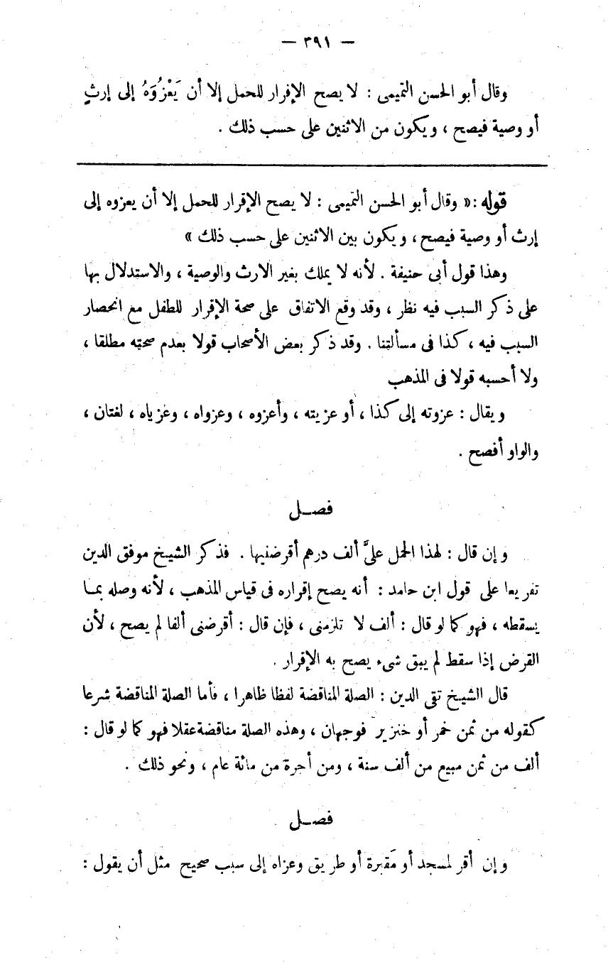 وقال أبو الحسن التميمي لا يصح الإقرار للحمل إلا أن يعزوه إلى إرث أو وصية فيصح ويكون من الاثنين على حسب ذلك.