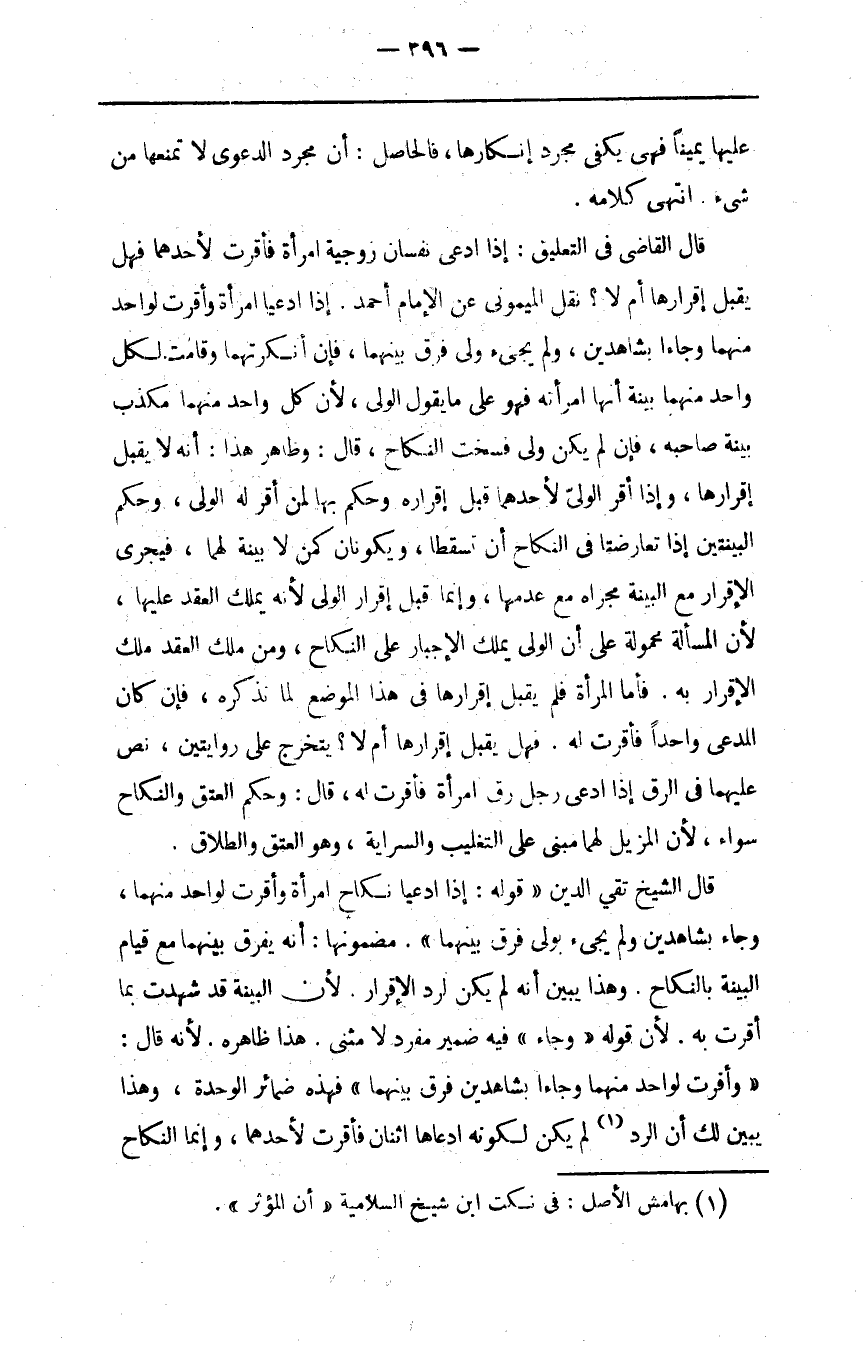 قال الشيخ تقي الدين "قوله إذا ادعيا نكاح امرأة وأقرت لواحد منهما وجاء بشاهدين ولم يجيء بولي فرق بينهما" مضمونها أنه يفرق بينهما مع قيام البينة بالنكاح وهذا يبين أنه لم يكن لرد الإقرار لأن البينة قد شهدت بما أقرت به لأن قوله وجاء فيه ضمير مفرد لا مثنى هذا ظاهره لأنه قال وأقرت لواحد منهما وجاءا بشاهدين فرق بينهما فهذه ضمائر الوحدة وهذا يبين لك أن الرد1 لم يكن لكونه ادعاها اثنان فأقرت لأحدهما وإنما النكاح