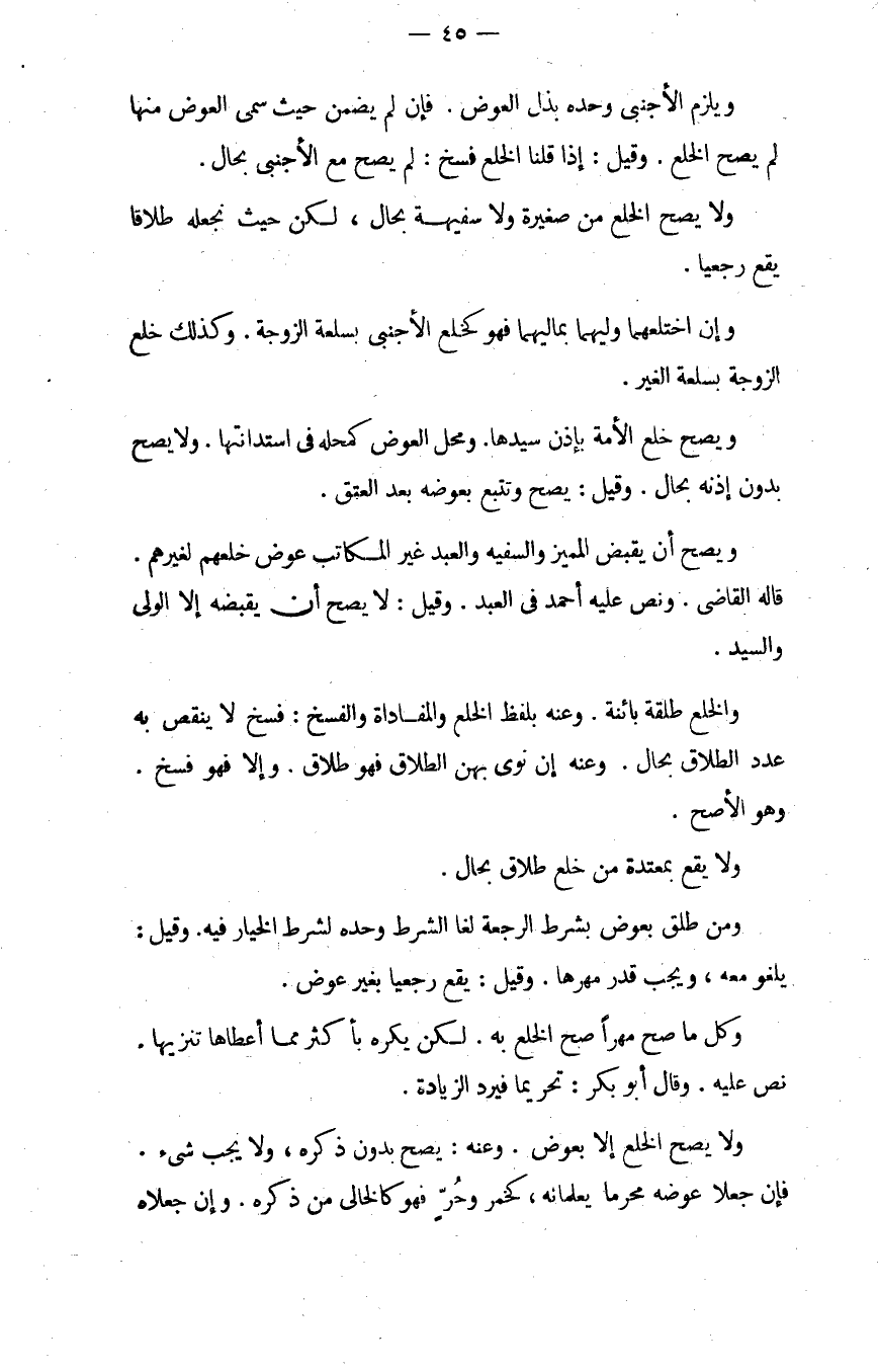 ولا يصح الخلع إلا بعوض وعنه يصح بدون ذكره ولا يجب شيء فإن جعلا عوضه محرما يعلمانه كخمر وحر فهو كالخالي من ذكره وإن جعلاه