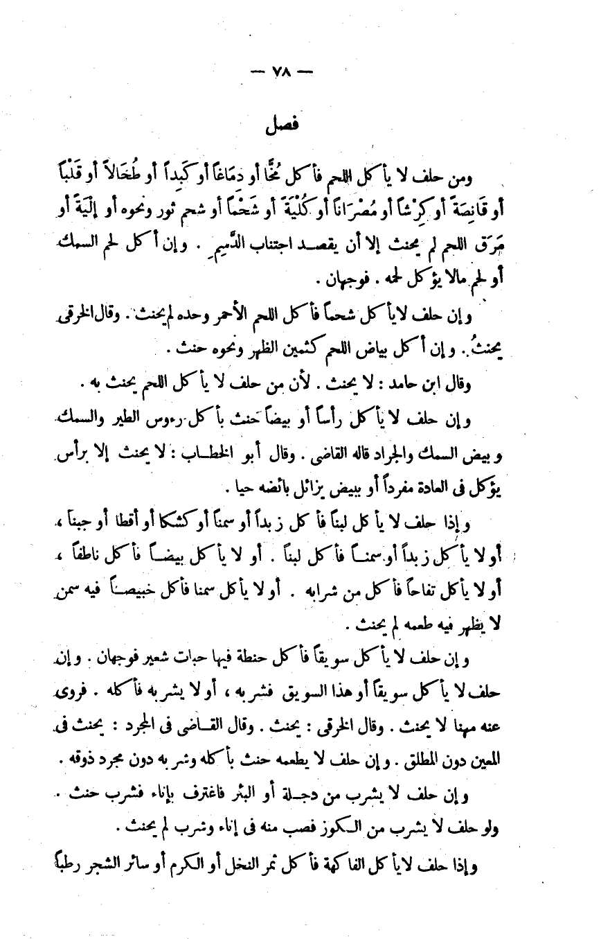 ومن حلف لا يأكل اللحم فأكل مخا أو دماغا أو كبدا أو طحالا أو قلبا أو قانصة أو كرشا أو مصرانا أو كلية أو شحما أو شحم ثور ونحوه أو إليه أو مرق اللحم لم يحنث إلا أن يقصد اجتناب الدسم وإن أكل لحم السمك أو لحم مالا يؤكل لحمه فوجهان.