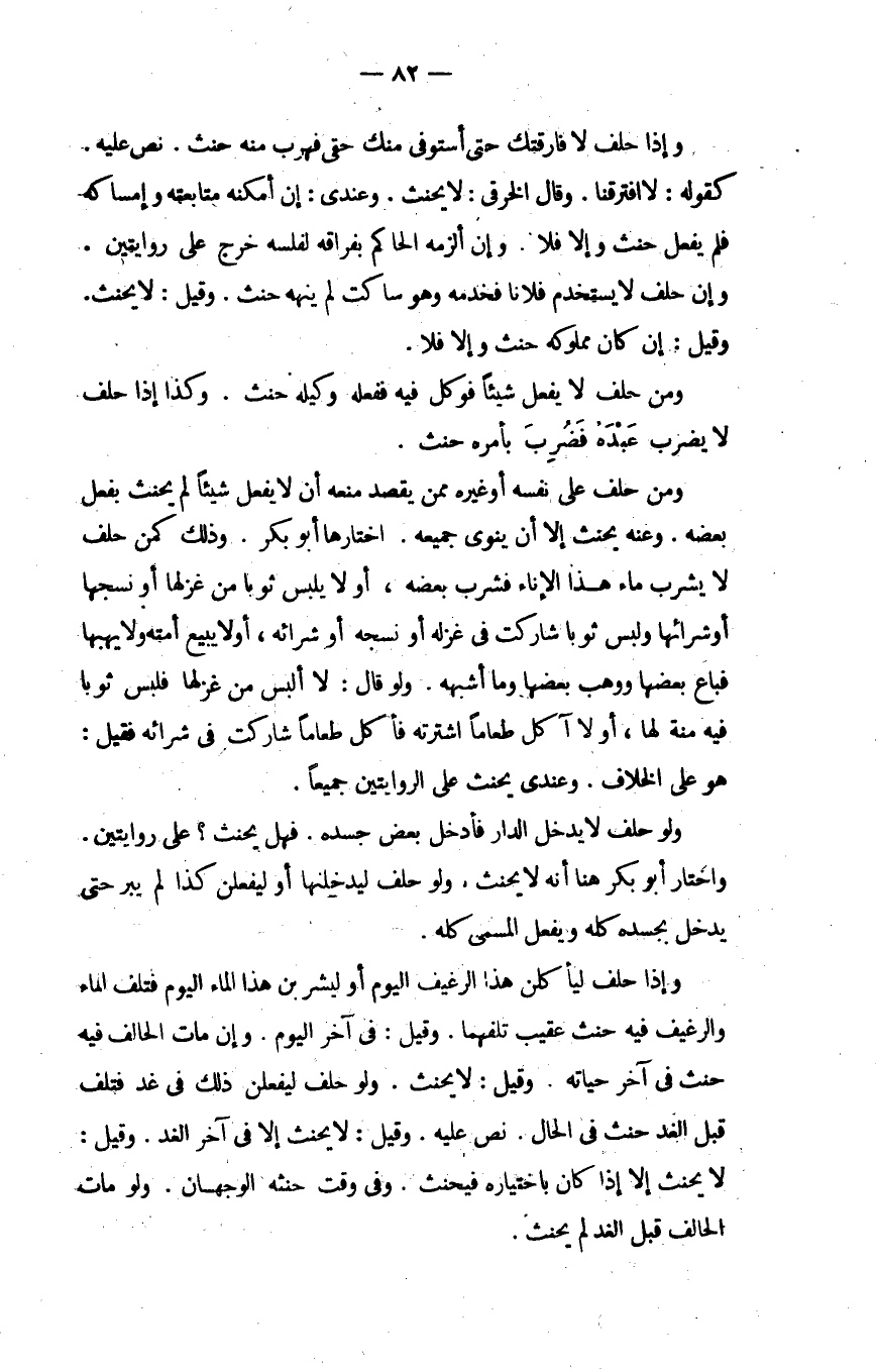 ومن حلف على نفسه أو غيره ممن يقصد منعه أن لا يفعل شيئا لم يحنث بفعل بعضه وعنه يحنث إلا أن ينوي جميعه اختارها أبو بكر وذلك كمن حلف لا يشرب ماء هذا الإناء فشرب بعضه أو لا يلبس ثوبا من غزلها أو نسجها أو شرائها ولبس ثوبا شاركت في غزله أو نسجها أو شرائه أو لا يبيع أمته ولا يهبها فباع بعضها ووهب بعضها وما أشبهه ولو قال لا ألبس من غزلها فلبس ثوبا فيه لها أو لا آكل طعاما فأكل طعاما شاركت في شرائه فقيل هو على الخلاف وعندي يحنث على الروايتين جميعا.